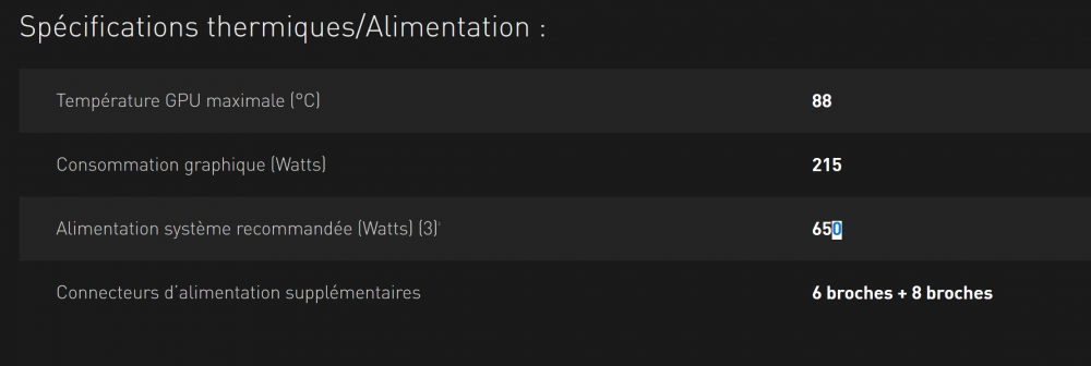 Spécifications thermiques/Alimentation : 94 Température GPU maximale (°C) 75 Consommation (Watts) 300 Alimentation système recommandée (Watts)(3) Aucun Connecteurs d'alimentation supplémentaires ce qui faudra faire attention c'est plutôt a l’alimentation en elle-même