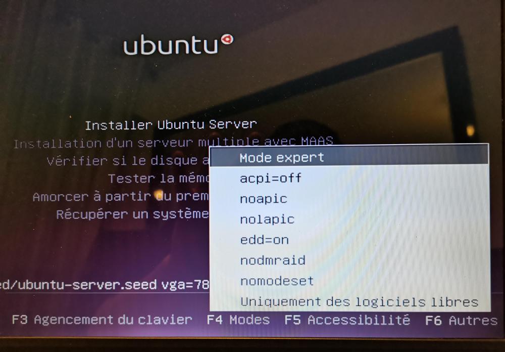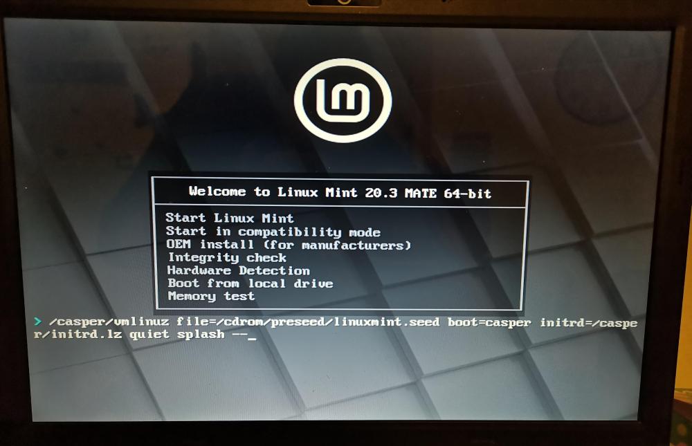 Lorsque je démarre avec Linux mint mate, Cinnamon ou xfce cela me fais un écran noir, la j'ai appuyer sur tab ça me marque la ligne que tu peux voir en dessous du menu. Faut-il écrire quelque chose pour commencer l'installation ?