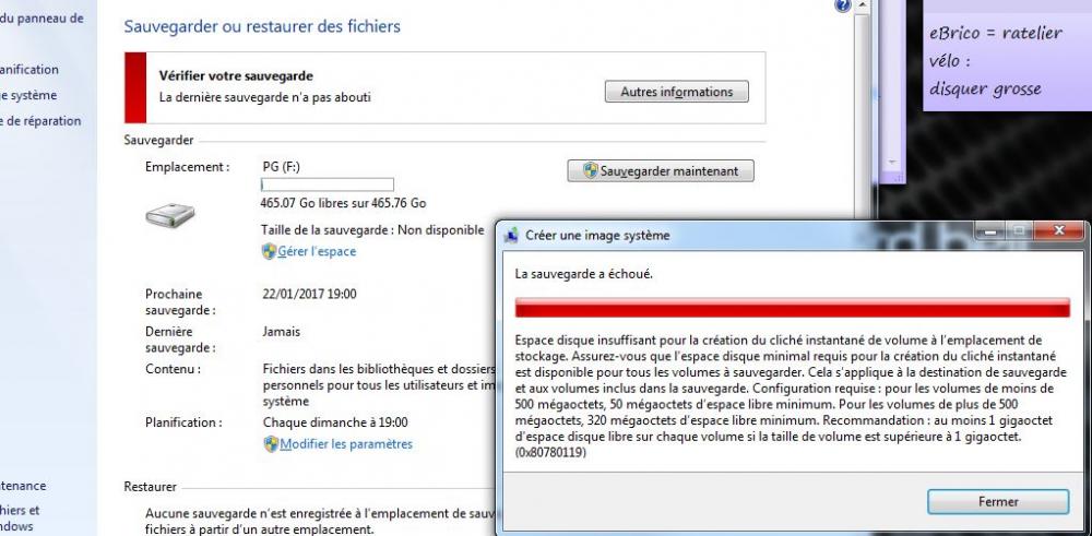 7. Bonjour à tous, pour créer l'image système du pc (270Go sur disque de 500 reformaté propre), la sauvegarde à partir du panneau de config m'annonce que l'espace disque est insuffisant!??? image jointe de cette annonce en pj. Que passa? Encore une fois merci d'avance pour votre aide. pg Screenshot :