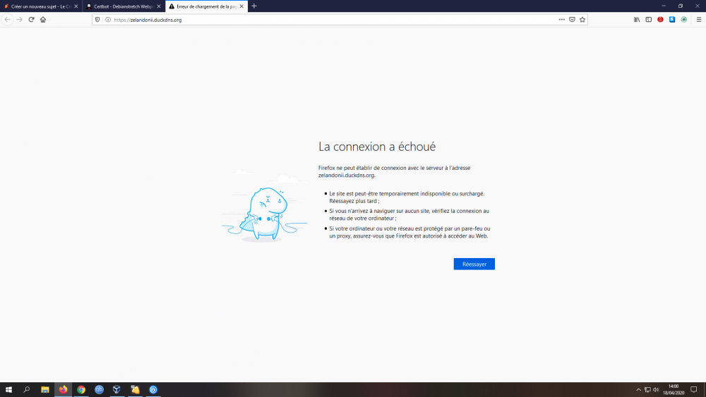 22. Bonjour à tous, J'ai voulu m'essayer à la gestion d'un serveur (et faire ainsi d'une pierre deux coups avec le stockage), j'ai donc suivi l'excellent tutoriel de notre ami ci-dessus. J'ai eu plusieurs ennuis lors de l'installation, que j'ai heureusement réussi à régler de moi-même mais là c'est au-dessus de mes connaissances. Lors de ma première connexion via le navigateur, j'ai remarqué que le cadenas avait un triangle disant que certains éléments de la page ne sont pas sécurisés, je me suis donc renseigné et ait appris l'existence de Let's Encrypt. Suite à plusieurs recherches et lectures de tuto sur le web, j'ai fini par arriver au site ci-dessous et c'est là que les ennuis commencent. https://certbot.eff.org/lets-encrypt/debianstretch-webproduct J'ai respecté (je crois) la marche à suivre et résultat, désormais je ne peux plus accéder à mon serveur (cf: pièce jointe). Je le PING toujours sans problème, je lui envoi des commandes et il répond parfaitement mais impossible d'ouvrir SEAFILE, j'ai donc bien un ennui de certificat sachant que l'application me dit que ce certificat n'est pas vérifié. J'en appelle donc aux compétences les plus élevées des membres, si ces derniers peuvent m'aider. Merci d'avance. Cordialement.