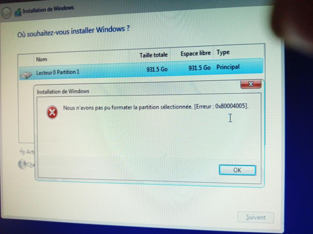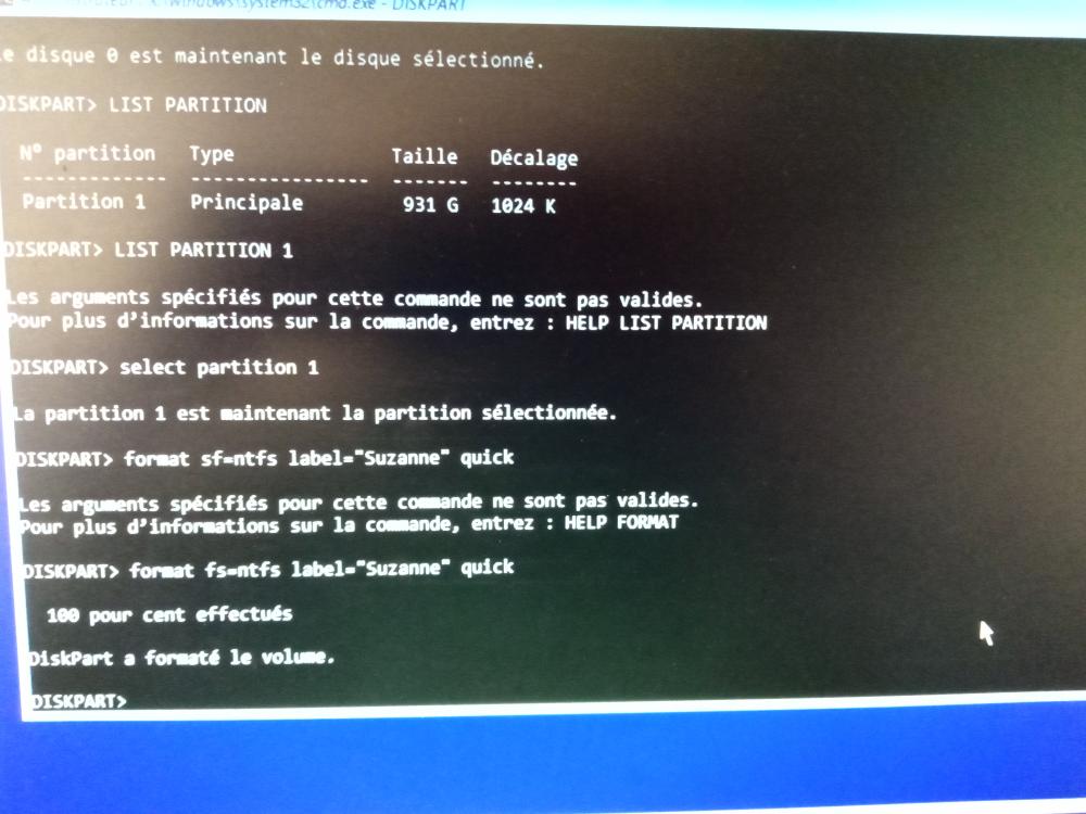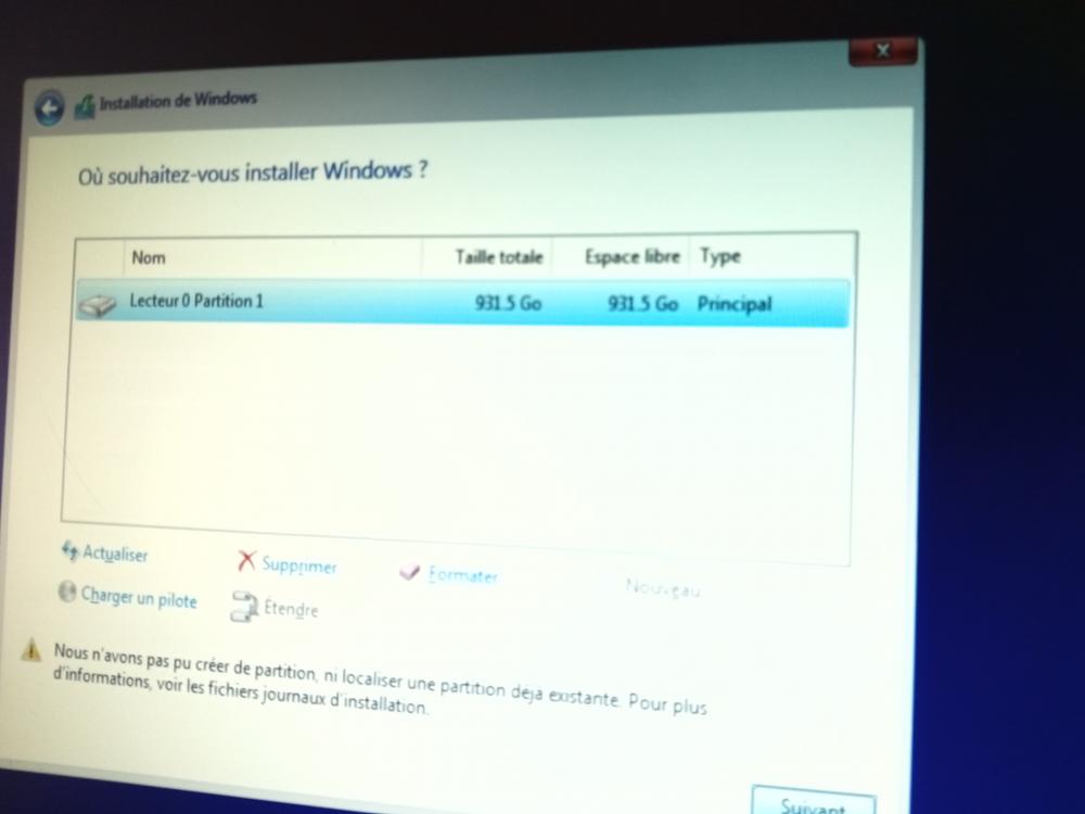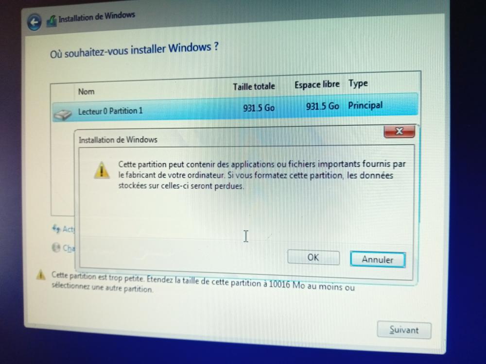 il n'y a qu'une patition elle est bleue ,j'ai appuyer sur formater voici le screen ,et je n'ai pas fait suivant ,vus le message -