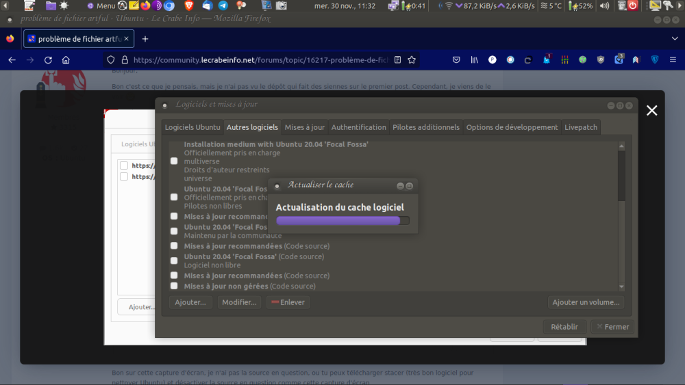 Je vais bien aussi, merci. Dis moi c'est un sacré langage chiffré que tu me donne là ! j'essaie de comprendre. Voici le retour. lenovo@lenovo-ThinkPad-L540:~$ find /etc/apt -name '*.list' -exec bash -c 'echo -e "\n$1\n"; nl -ba "$1"' _ '{}' \; /etc/apt/sources.list 1 # deb cdrom:[Ubuntu-MATE 20.04.1 LTS _Focal Fossa_ - Release amd64 (20200731)]/ focal main multiverse restricted universe 2 3 # See http://help.ubuntu.com/community/UpgradeNotes for how to upgrade to 4 # newer versions of the distribution. 5 deb http://fr.archive.ubuntu.com/ubuntu/ jammy main restricted 6 # deb-src http://fr.archive.ubuntu.com/ubuntu/ focal main restricted 7 8 ## Major bug fix updates produced after the final release of the 9 ## distribution. 10 deb http://fr.archive.ubuntu.com/ubuntu/ jammy-updates main restricted 11 # deb-src http://fr.archive.ubuntu.com/ubuntu/ focal-updates main restricted 12 13 ## N.B. software from this repository is ENTIRELY UNSUPPORTED by the Ubuntu 14 ## team. Also, please note that software in universe WILL NOT receive any 15 ## review or updates from the Ubuntu security team. 16 deb http://fr.archive.ubuntu.com/ubuntu/ jammy universe 17 # deb-src http://fr.archive.ubuntu.com/ubuntu/ focal universe 18 deb http://fr.archive.ubuntu.com/ubuntu/ jammy-updates universe 19 # deb-src http://fr.archive.ubuntu.com/ubuntu/ focal-updates universe 20 21 ## N.B. software from this repository is ENTIRELY UNSUPPORTED by the Ubuntu 22 ## team, and may not be under a free licence. Please satisfy yourself as to 23 ## your rights to use the software. Also, please note that software in 24 ## multiverse WILL NOT receive any review or updates from the Ubuntu 25 ## security team. 26 deb http://fr.archive.ubuntu.com/ubuntu/ jammy multiverse 27 # deb-src http://fr.archive.ubuntu.com/ubuntu/ focal multiverse 28 deb http://fr.archive.ubuntu.com/ubuntu/ jammy-updates multiverse 29 # deb-src http://fr.archive.ubuntu.com/ubuntu/ focal-updates multiverse 30 31 ## N.B. software from this repository may not have been tested as 32 ## extensively as that contained in the main release, although it includes 33 ## newer versions of some applications which may provide useful features. 34 ## Also, please note that software in backports WILL NOT receive any review 35 ## or updates from the Ubuntu security team. 36 deb http://fr.archive.ubuntu.com/ubuntu/ jammy-backports main restricted universe multiverse 37 # deb-src http://fr.archive.ubuntu.com/ubuntu/ focal-backports main restricted universe multiverse 38 39 40 deb http://security.ubuntu.com/ubuntu jammy-security main restricted 41 # deb-src http://security.ubuntu.com/ubuntu focal-security main restricted 42 deb http://security.ubuntu.com/ubuntu jammy-security universe 43 # deb-src http://security.ubuntu.com/ubuntu focal-security universe 44 deb http://security.ubuntu.com/ubuntu jammy-security multiverse 45 # deb-src http://security.ubuntu.com/ubuntu focal-security multiverse 46 47 # This system was installed using small removable media 48 # (e.g. netinst, live or single CD). The matching "deb cdrom" 49 # entries were disabled at the end of the installation process. 50 # For information about how to configure apt package sources, 51 # see the sources.list(5) manual. /etc/apt/sources.list.d/lutris-team-ubuntu-lutris-focal.list 1 # deb http://ppa.launchpad.net/lutris-team/lutris/ubuntu jammy main # désactivé pour la mise à niveau vers jammy 2 # deb-src http://ppa.launchpad.net/lutris-team/lutris/ubuntu focal main /etc/apt/sources.list.d/bitmask.list 1 deb http://deb.leap.se/client release artful /etc/apt/sources.list.d/lah7-ubuntu-ubuntu-mate-colours-focal.list 1 # deb http://ppa.launchpad.net/lah7/ubuntu-mate-colours/ubuntu jammy main # désactivé pour la mise à niveau vers jammy 2 # deb-src http://ppa.launchpad.net/lah7/ubuntu-mate-colours/ubuntu jammy main # désactivé pour la mise à niveau vers jammy /etc/apt/sources.list.d/brave-browser-release.list 1 # deb [arch=amd64] https://brave-browser-apt-release.s3.brave.com/ stable main # désactivé pour la mise à niveau vers jammy /etc/apt/sources.list.d/nerdherd-ubuntu-cloud-focal.list 1 # deb http://ppa.launchpad.net/nerdherd/cloud/ubuntu focal main 2 # deb-src http://ppa.launchpad.net/nerdherd/cloud/ubuntu focal main /etc/apt/sources.list.d/obsproject-ubuntu-obs-studio-focal.list 1 # deb http://ppa.launchpad.net/obsproject/obs-studio/ubuntu jammy main # désactivé pour la mise à niveau vers jammy 2 # deb-src http://ppa.launchpad.net/obsproject/obs-studio/ubuntu focal main /etc/apt/sources.list.d/openafs-ubuntu-stable-focal.list 1 # deb http://ppa.launchpad.net/openafs/stable/ubuntu jammy main # désactivé pour la mise à niveau vers jammy 2 # deb-src http://ppa.launchpad.net/openafs/stable/ubuntu focal main /etc/apt/sources.list.d/micahflee-ubuntu-ppa-focal.list 1 # deb http://ppa.launchpad.net/micahflee/ppa/ubuntu jammy main # désactivé pour la mise à niveau vers jammy 2 # deb-src http://ppa.launchpad.net/micahflee/ppa/ubuntu focal main lenovo@lenovo-ThinkPad-L540:~$