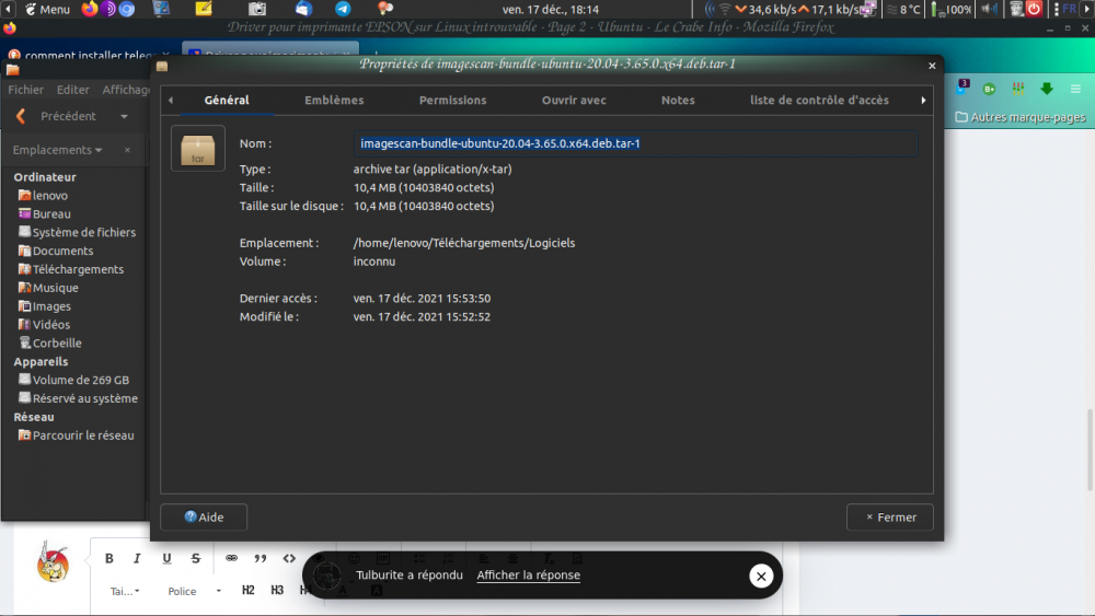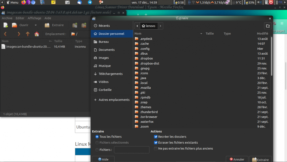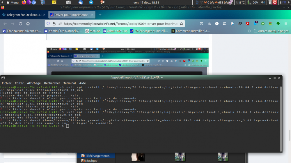 je viens de faire ca, le dossier fini par tar.gz au lieu de tar.1 j'ai refais la manip sur le terminal et je suis naavré de te dire que ca fait rien/ quand je passe par le gestionnaire d'archive et en double cliquant sur les bons fichiers /core/ et imagesacne xxx.deb ca me dis qu'il ne peu pas etre installé sur mon système... donc C qu'il ne peu pas etre installé sur mon système ! c'est quand même étrange !!! sudo apt install /home/lenovo/Téléchargement/imagescan-bundle ubuntu-20.04-3.65.0.x64.deb/core/imagescan_3.65.0-1epson4ubuntu20.04_amd64.deb