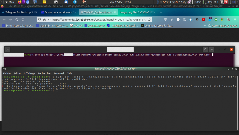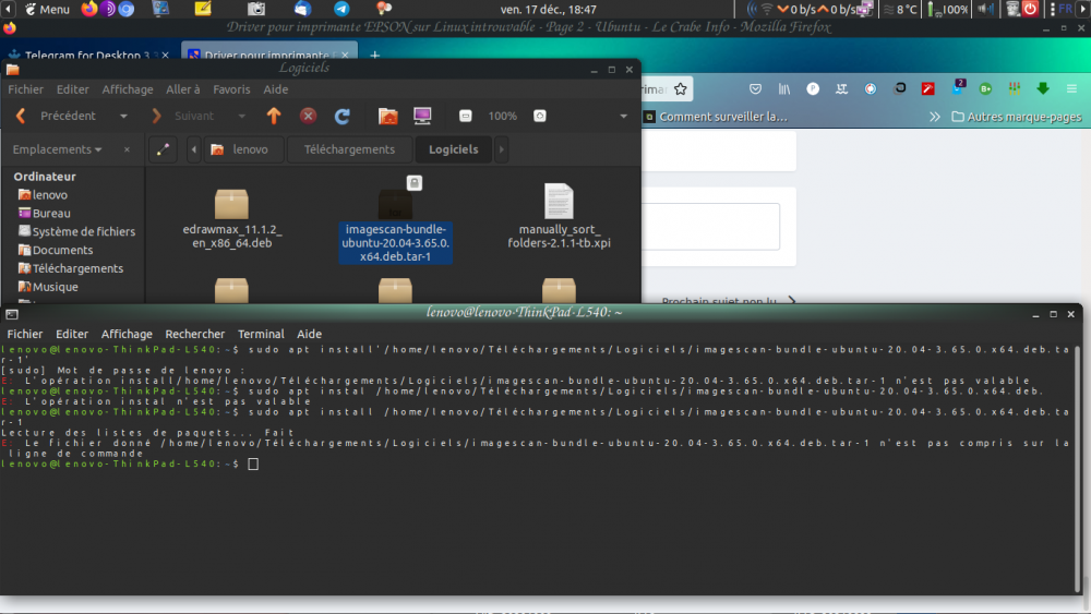 J'ignorais qu'on pouvais glisser un fichier dans le terminal ! je viens d'essayer, ca ne fonctionne pas le glisser. le terminal rete dessous la fenètre du fichier et ca ne colle pas. sinon j'ai retenté énième fois sans oublier le s de téléchargement et rebelote tjr rien. sudo apt install /home/lenovo/Téléchargement/Logiciels/imagescan-bundle-ubuntu-20.04-3.65.0.x64.deb.tar-1