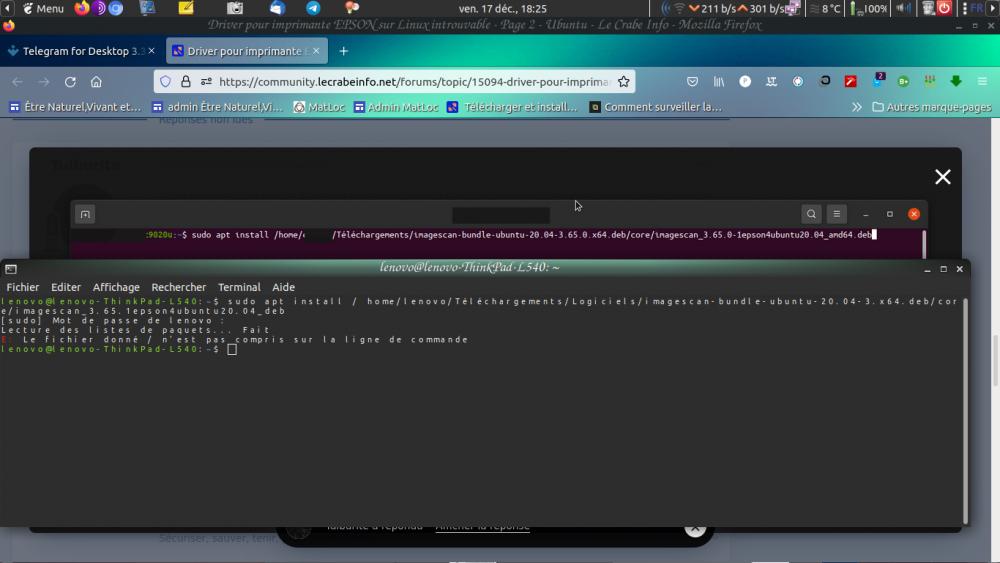 Raté ! ca ne fonctionne pas des 2 façons. Voici le retour lenovo@lenovo-ThinkPad-L540:~$ sudo apt install /home/lenovo/Téléchargement/Logiciels/imagescan-bundle-ubuntu-20.04-3.65.0.x64.deb.tar-1 [sudo] Mot de passe de lenovo : Lecture des listes de paquets... Fait E: Le fichier donné /home/lenovo/Téléchargement/Logiciels/imagescan-bundle-ubuntu-20.04-3.65.0.x64.deb.tar-1 n'est pas compris sur la ligne de commande lenovo@lenovo-ThinkPad-L540:~$ sudo apt install /home/lenovo/Téléchargement/Logiciels/imagescan-bundle-ubuntu-20.04-3.65.0.x64.deb.tar-1/imagescanbuntu-20.04-3.65.0.x64.deb/core/imagescan_3.65.0-1epson4ubuntu20.04_amd64.deb Lecture des listes de paquets... Fait E: Le fichier donné /home/lenovo/Téléchargement/Logiciels/imagescan-bundle-ubuntu-20.04-3.65.0.x64.deb.tar-1/imagescanbuntu-20.04-3.65.0.x64.deb/core/imagescan_3.65.0-1epson4ubuntu20.04_amd64.deb n'est pas compris sur la ligne de commande lenovo@lenovo-ThinkPad-L540:~$ ^C