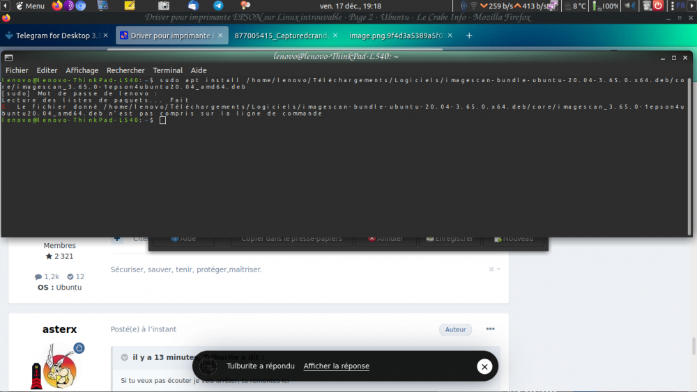 Oh punaise !!! ca y est ! mais oui il fallait le décompresser !! j'ai pu glisser directement le fichier .deb dans le terminal apres sudo apt install et zou c'est parti 🤯😅🥳 Merci @Tulburite 🙏 je vais essayer de refaire le tuto et de le marquer comme résolu On en a chier !!! je n'ai pas encore vérifié si mon imprimante fonctionne !