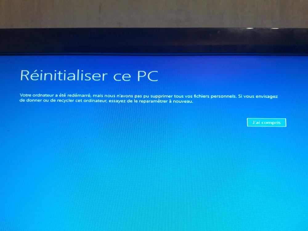 7. Bonsoir à tous et à toutes. Suite à différents soucis avec ma machine, j'ai décidé de réinitialiser mon Pc en passant par l'outil de réinitialisation de Windows 10, en utilisant la Méthode 1 Cas 2 comme décrit dans votre article. Cela sans conserver mes fichiers, mais en choisissant l'option qui ne nettoie pas le lecteur, et en ciblant uniquement le lecteur C: où se trouvait Windows. Jusqu'ici tout va bien, la procédure se lance normalement, jusqu'à 100%. Et là mon écran m'affiche ceci (photo jointe). À partir de là je ne sais plus quoi faire. Impossible de cliquer, ma souris est éclairée mais je ne vois pas de curseur, et ni mon clavier ni elle ne répondent. J'ai tenté de l'éteindre et le redémarrer manuellement, mais j'atterris chaque fois sur ce même écran. J'ai tenté de débrancher et rebrancher mes claviers et souris sur différents ports, et branché une autre souris. J'ai tenté de relancer Windows avec un disque de récupération système en lui demandant de booter sur le disque depuis les options de démarrage du bios (là le clavier répond ), mais idem, rebasculée encore et toujours sur le même écran . Je n'ose pas essayer autre chose car je n'y connais rien. Mon ordinateur est un HP Pavillon P62350. J'espère que vous pourrez m'aider ! Merci d'avance !