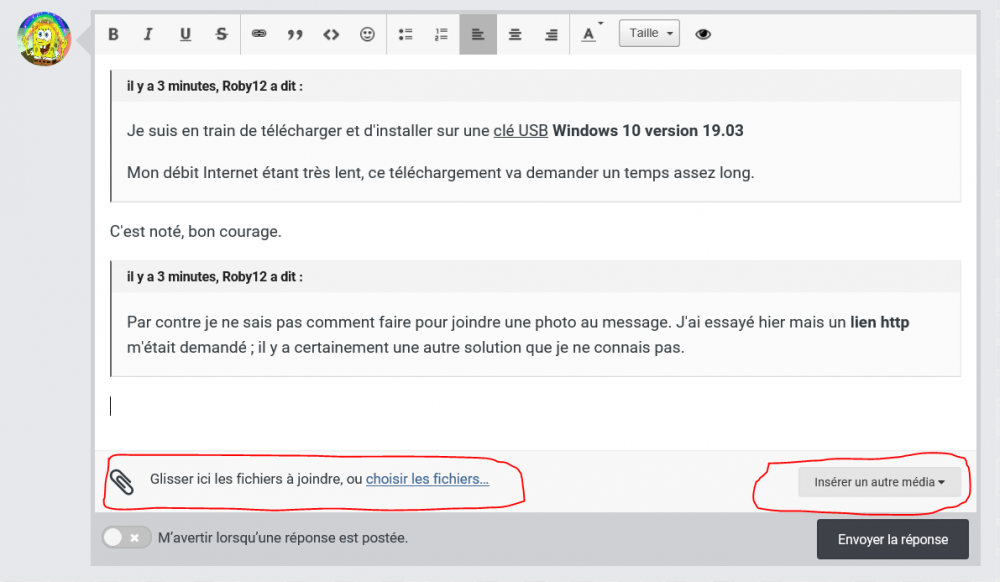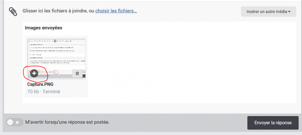 C'est noté, bon courage. Lors de la rédaction d'un message vous avez une zone juste dessous. Choisissez l'image voulu, vous obtenez ceci : Cliquez sur le + et tadam ! vous avez une image dans votre message.