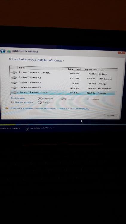 quand je clique sur le premier lecteur SYSTEM il me dit Windows doit être installé dans une partition formatée en NTFS, Windows ne peut être installé dans cet espace disque la partition est une partition système EFI (ESP)