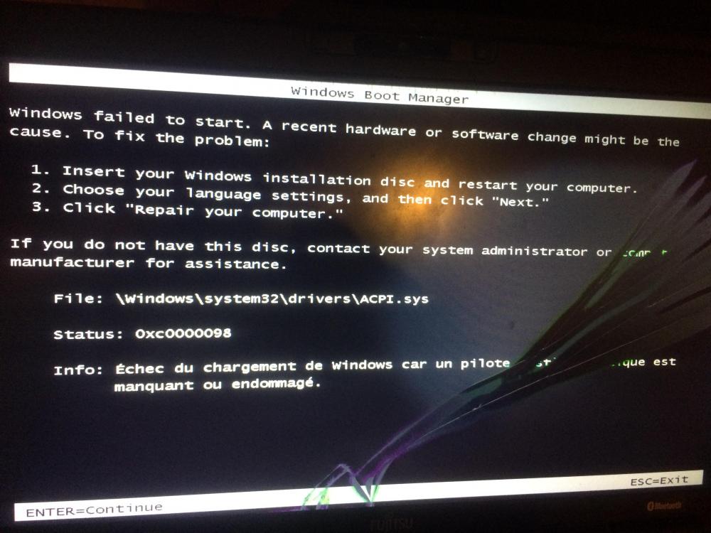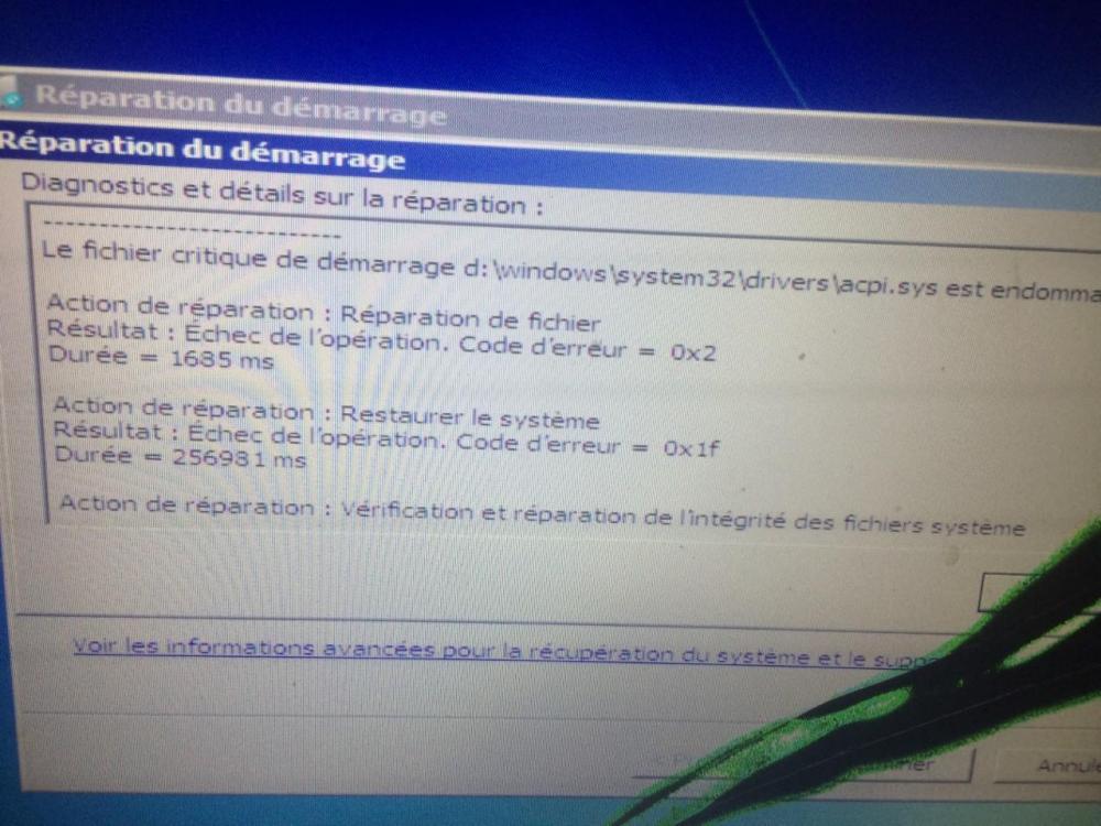 11. Au secours je n'arrive pas à réparer WIN7, à priori erreur dans ACPI.SYS je viens d'essayer avec SFC /scannow et il me dit qu'une réparation est (déjà?) en cours est que après redémarrage.. Impossible également de réinstaller Win 7 Bien sûr il y a toute ma vie dans l'ordi.... Merci pour votre possible aide