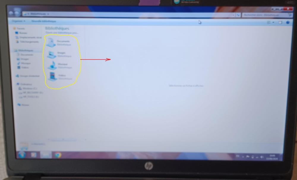 Bonjour à Tous, J'ai reçu un ancien PC HP sous W7 mais je souhaite pour une question d'organisation de l'écran rétablir les différents dossiers. Pour être mieux compris, je glisse une photo : En fait, je voudrais que la partie entourée en JAUNE soit installer sur le grand écran (flèche rouge) et fermer donc la fenêtre en JAUNE. Pouvez-vous m'aider ? Merci