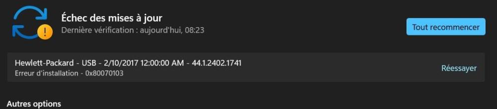 Bonjour à Tous, Détenteur d'un PC LENOVO Ideapad 320 sous W11 connecté à une imprimante HP Envy Photo 7830, je rencontre un problème au niveau de la mise à jour de cet appareil Je constate que cette mise à jour date de 2017 ??? J'ai donc cherché comment pouvoir effacer cette mise à jour et pour cela, j'ai effectué les opérations suivantes : - téléchargement de wushowhide pour masquer - désinstallation et réinstallation (HP Smart) de l'imprimante. Malgré cela, le problème persiste toujours et je me trouve à court d'idées. Pouvez-vous me conseiller ? Merci