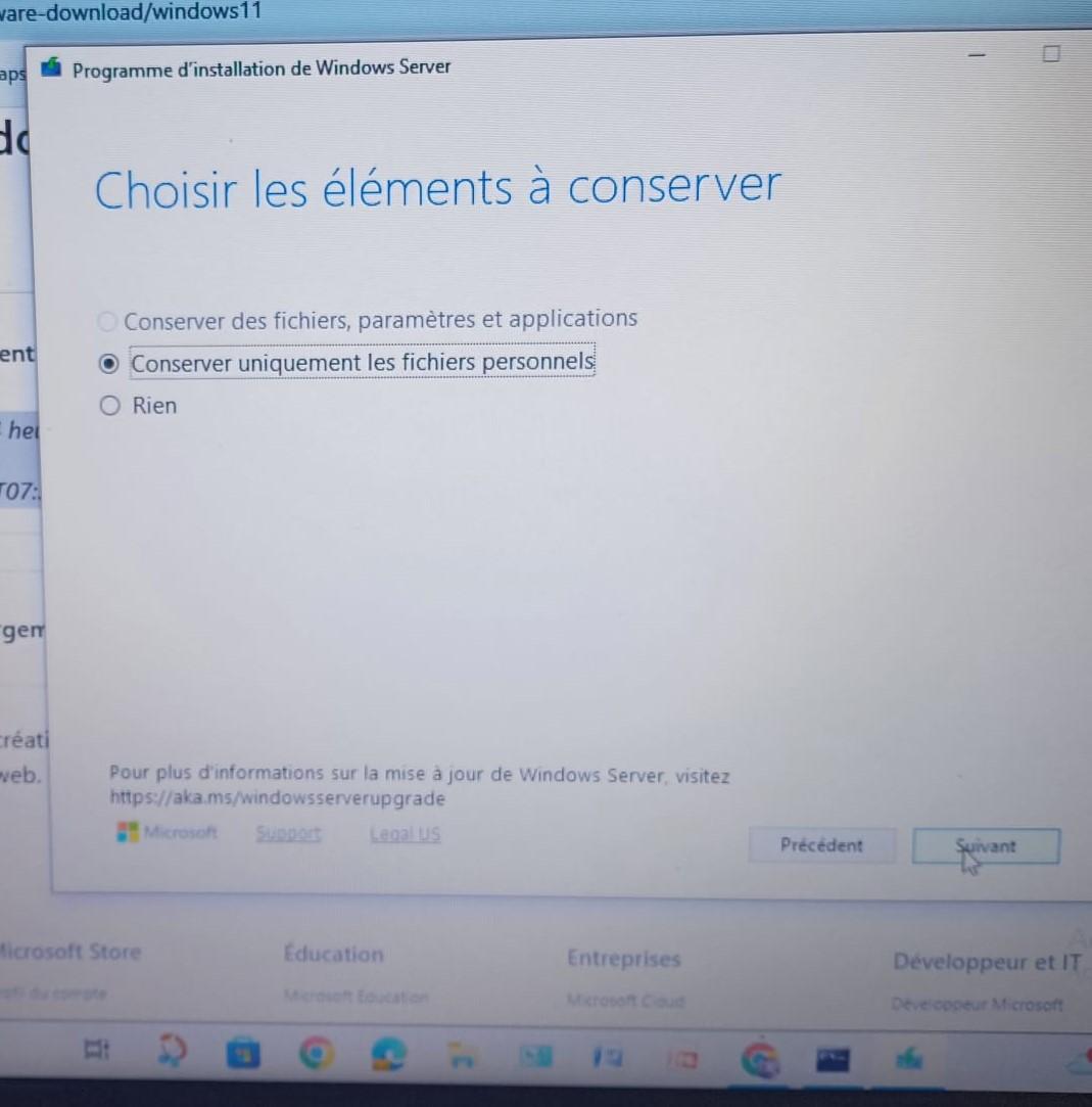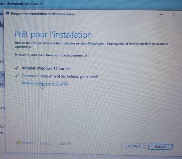 Bonjour à TOUS, Détenteur d'un second PC de marque Dell sous W10 et vu l'arrêt des mises à jour, j'ai tenté de faire basculer ce dernier en W11. L'installation semblait se dérouler correctement jusqu'au moment où il m'a été demandé de "choisir les éléments à conserver" et là malgré la mention "modifier les éléments à conserver", il m'est impossible d'inclure "conserver les fichiers, paramètres et applications". Je me demande donc quel impact cela peut avoir sur mon appareil. Je suppose que le PC dont je dispose ne possède pas les caractéristiques requises pour W11. Pour l'installation, j'ai utilisé la méthode product server Pouvez-vous me conseiller ? Merci