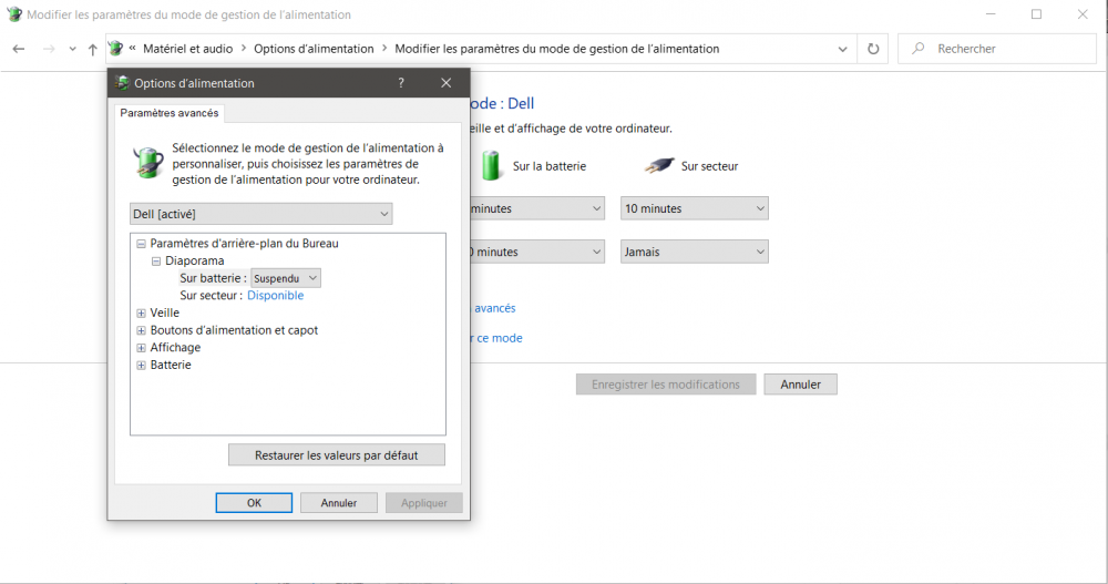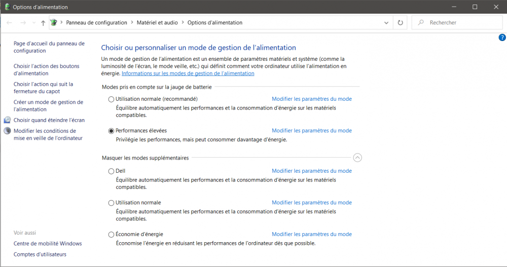 Ouai j'aimerais bien comprendre aussi :D Il me manquait Performances Optimales mais j'avais déjà trouvé la ligne de commande :) Pour info, je viens de réaliser que du coup, le curseur pour changer les option depuis l'icône "batterie" à disparue. Bon débarras !:D Mais bon ! mes problèmes ne s'arrêtent pas là ;) J'en ai pas parlé ici puisque ça n'a rien à voir , du coup je vais sûrement ouvrir un autre sujet, youhouuu!! Encore merci !! A toute
