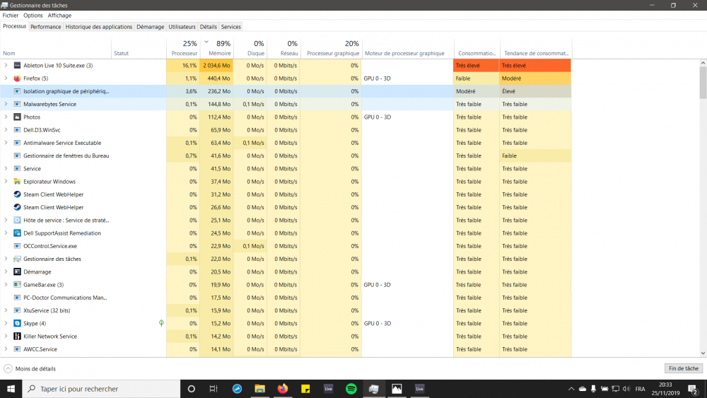 Me revoici ! C'est de ça ET du mode Performances Elevées/Optimales auxquelles je n'ai pas du tout accès. Voici quelques screens@Yves B. Et voici le screen pour @Delta Il n'y a que 2 processus actifs cette fois, je ne sais pas pourquoi. Hier soir j'ai voulu relancer Ableton pour pour voir et le CPU dépassait 20/25% pour le même projet tjs... Quand je parle de ça, c'est la valeur de l'indicateur qui se trouve dans Ableton et qui est visible tout le temps. Et sinon j'ai ça depuis l'icône "batterie". Mais ce que je trouve bizarre c'est que en jeu ( Rocket league, CS:GO) je n'ai absolument aucun problème, que je mette le curseur au milieu en mode "Meilleures performances" ou Performances optimales. Ableton a l'air de mal géré un truc. Je ne suis pas le seul apparemment , mais le problème était souvent réglé en activant le mode Perfomances Optimale.