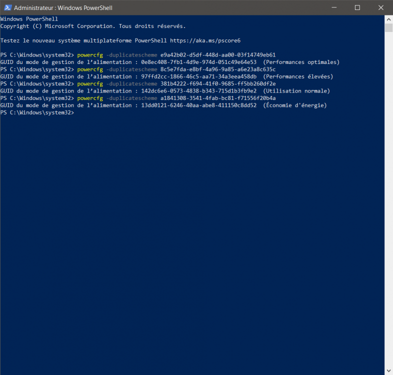 J'en ai seulement 4 ! Et un ou deux VST mais c'est vraiment rien du tout du tout :'( @Yves B. Dans mon premier post je parle de ça, j'avais trouve qu'une seule ligne de commande, pour le mode High Performance et ça n'avait fonctionné, pourtant dans PowerShell c'était bon. J'essaierai celles que tu m'as donné, merci :)