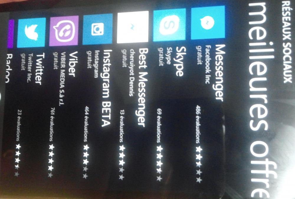 Bonjour à tous, J'ai un problème mon Nokia lumia 1320 pricipalement au niveau de l'installation de l'appli Whatsapp. Premièrement, j'ai crée un compte Microsoft pour pouvoir entrer dans le store et télécharger les applications et installer sur le Nokia. Curieusement, j'ai installé ucbrowser et Messenger sans problème mais lorsque j'entre dans le store principalement au niveau des réseaux sociaux , il y'en a viber,imo,twitter etc mais pas de Whatsapp pourtant sur le site web de Whatsapp il ya whatsapp pour windows et c'est bien dit que c'est gratuit ici mais je ne parviens pas à le télécharger. . S'il vous plait,auriez vous une idée mes potes? je compte sur vous! cool