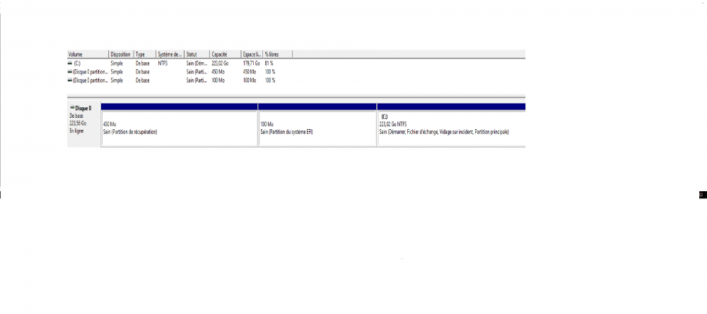 Bonjour @KRISTOBALexcusez moi d'avoir mis autant de temps à répondre. Ma réinstallation a été faite depuis le bios (au lieu de démarrer mon pc sur le disque normal je l'ai démarrer sur la clé USB contenant la restauration de Windows). Et lors de la réinstallation (déjà je n'ai pas la même interface) mais il n'y a pas mon ssd, il y a juste une partition de 223G et d'autres petites partitions). J'ai un technicien informaticien qui devrait passer chez moi donc je pourrais lui demander conseille.