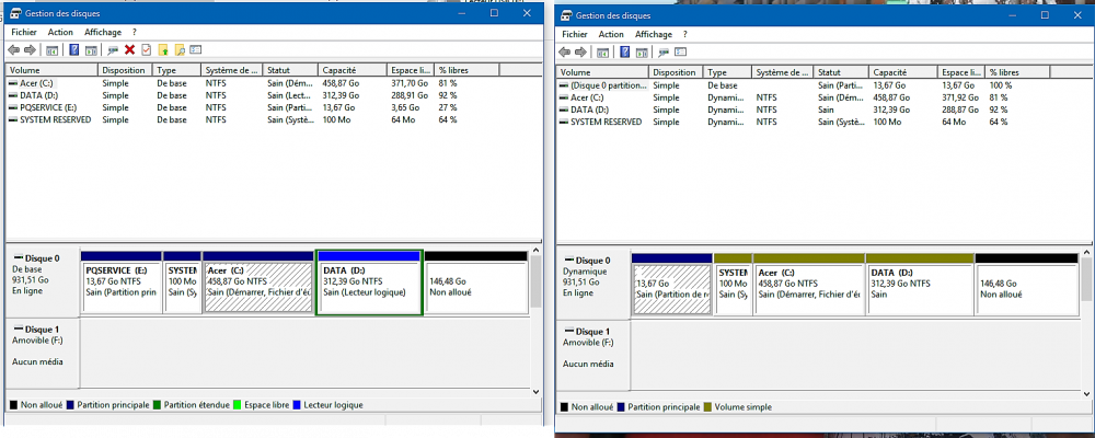 Bonjour , j'ai voulu réduire une partition et créer une nouvelle partition comme et je me suis planté donc mes disques durs C: D : n'etait plus reconnus en partitions principales j'ai acheter le logiciel AOMEI PA PROFESSIONAL J'ai converti les disques dynamiques en disques de bases et tout et rentrer dans l'ordre .MERCI de vous êtes intéressé a mon sujet bonne continuation pour votre site que j'ai un peu de mal a comprendre car je suis un novice en informatique et ses grâces a tout vos tutos que j'arrive un peu à me débrouillé