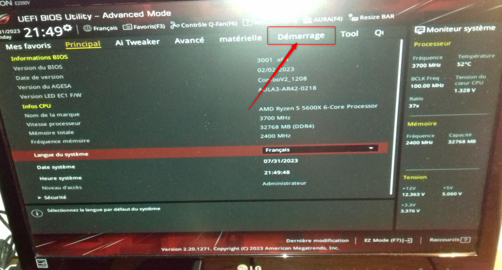 Bonjour, Je vois l'onglet "Démarrage" ici : C'est ici que tu doit chercher le secure boot et l'activer en choisissant Windows UEFI mode comme ici ( en anglais dans le texte) : tiens moi au courant , Merci ! ( et merci @Le PoissonClown pour les captures !!)