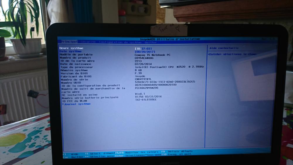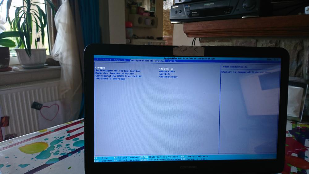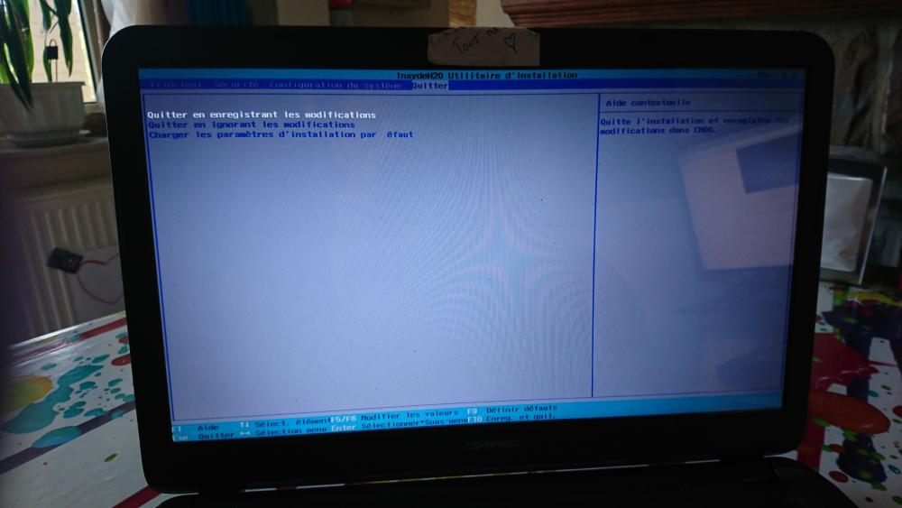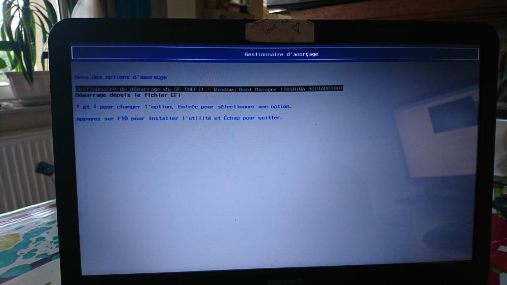 23. alors, j'explique en détail. Ma femme a un pc portable compaq avec windows 10 Elle souhaitait passer à Windows 7, et habituellement c'est moi qui m'occupe des pc (jusqu’à aujourd'hui, je me démerdais toujours bien...) mais par manque de temps de ma part, un pote a voulu s'en charger, mais il n'a pas réussi... Il a tout formaté, et ne parvenait pas à installer windows 7 (l'installation bloquait au moment starting windows, j'ai vu ici sur le forum que ça arrivait souvent, et j'ai vu que c’était souvent dû au fait que le secure boot soit activé...) J'ai récupéré l'ordi, suis allé dans le bios pour désactiver secure boot, et quand j'ai voulu ensuite aller dans les paramètres du micro programme uefi, j'ai vu que je n'y accédais pas, je tombais sur le menu que je viens de vous envoyer en photo. j'ai restauré le pc avec les disques de restauration gravés apres l'achat de l'ordi, et me suis donc retrouvé avec un windows 8 ('l'OS d'origine du pc), mais toujours pas d’accès a l'uefi Alors j'ai fait appel a vous, et j'ai suivi toutes les manip du tuto proposé par poisson clown. Mais quand j'essaie d’accéder à l'uefi, de nouveau je retombe sur le menu de démarrage...