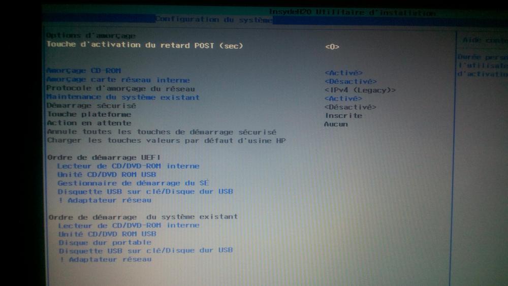 3. Bonjour ou bonsoir à tous et à toutes. Je voudrais de prime abord vous remercier pour l'opportunité que vous me donnez de vous poser ma préoccupation. J'ai acheté un ordinateur portable de marque HP Notebook Pavillon 2000 sans un système d'exploitation préalablement installé. Après avoir créé la clé USB bootable, j'ai démarré le processus. Arrivé sur la partie ou je dois sélectionner le disque on me sort cette phrase : Windows ne peut pas être installé sur ce disque. Le disque sélectionné possède une table de partition MBR. Sur les systèmes EFI, Windows peut uniquement être installé sur des disques EFI. J'ai parcouru déjà les articles du site qui ont traité le sujet mais je n'arrive pas à appliquer cela avec ma machine HP. Comme vous pouvez le voir sur la capture envoyée dans mon BIOS setup je ne peux pas désactiver le Secure Boot ni activé L'UEFI BOOT et encore même entré dans l'invite de commande. Il y'a beaucoup d'étapes que je ne peux pas suivre car cela diffère de ma machine. Du coup je suis bloqué et j'ai besoin urgemment que quelqu'un m'aide. Je précise que je suis novice en informatique. Merci infiniment Ahmed Franck
