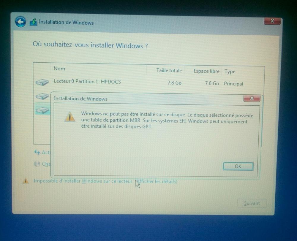 2. Merci @kristobal j'ai réussi finalement à installer Windows 10. J'ai convertir mon disque MBR en GPT et ça marché. Merci beaucoup.