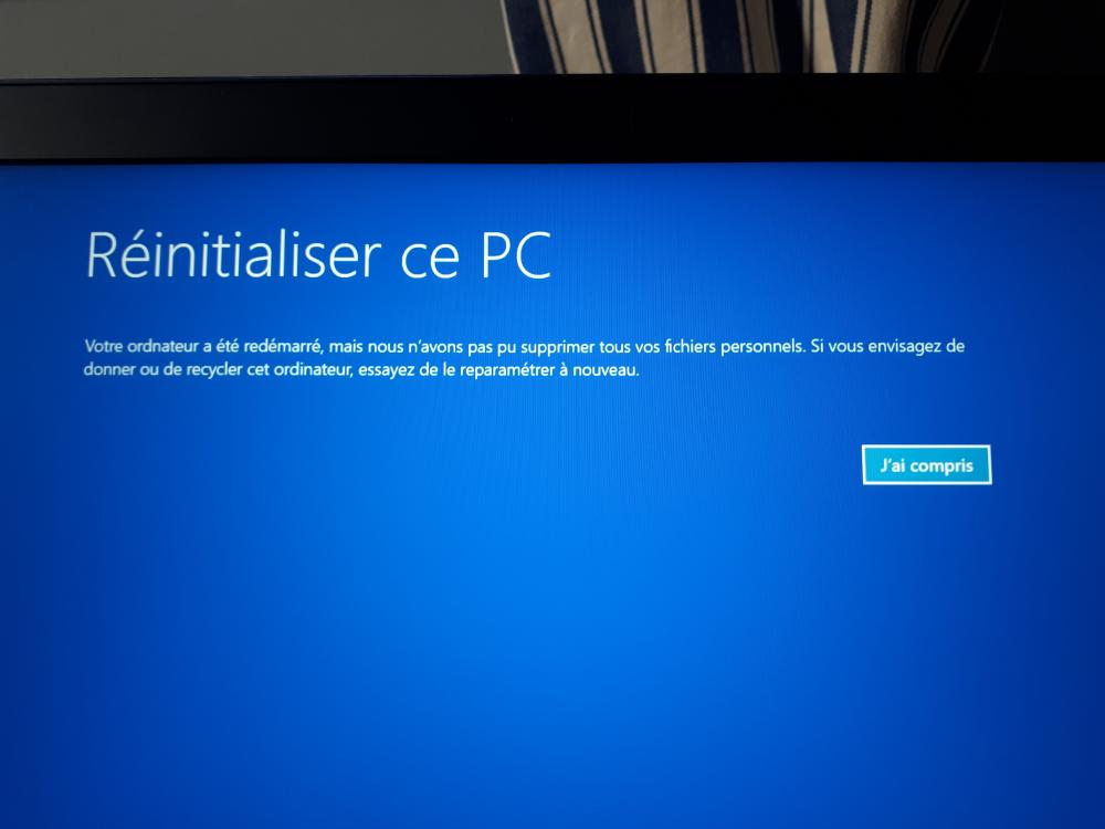 Je ne choisi de réinitialiser que la partition Windows, donc C: et non D: où sont tous mes docs. C'est là que le problème surviens: au premier essais la réinitialisation se stoppe et on m'indique qu'il y a eu un échec, aucun moyen de savoir pourquoi. Et au second essais tout se passe bien jusqu'à 82% environ, ça se stoppe. et windows m'indique que tous mes fichiers n'ont pas étés supprimés, ensuite l'installation de windows se fait normalement. Pour être sûr j'ai relancé l'opération une troisième fois, nouvel échec dès le départ, puis une quatrième, nouveau message pour me dire que tous les fichiers ne sont pas supprimés.