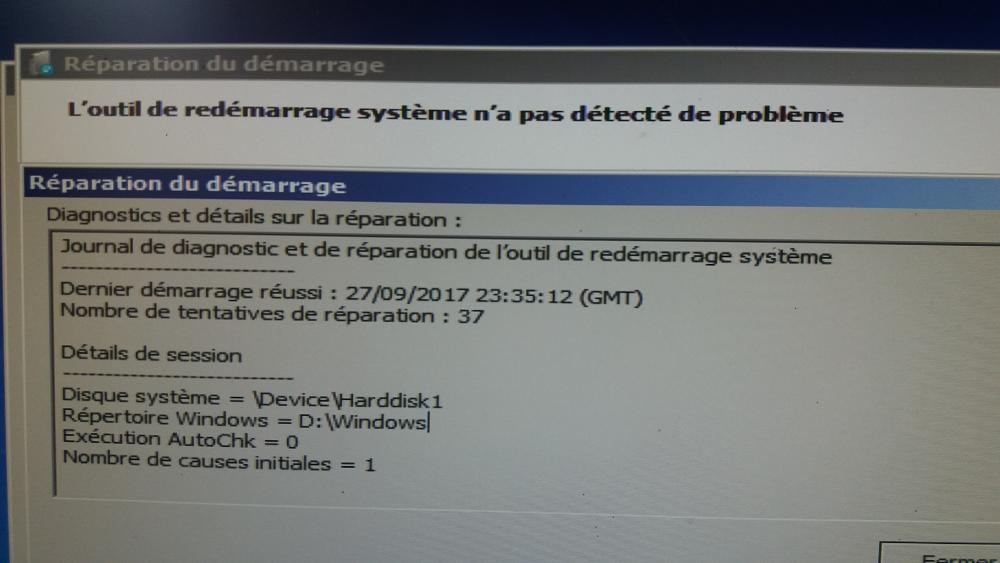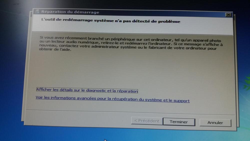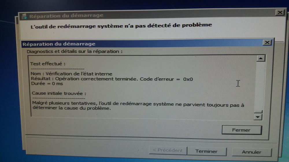 12. Bonjour à tous et à toute, Je vien vous exposer mon problème un peu délicat rencontré hier: Au démarrage du pc, à la place d'avoir l'écran de chargement habituel un écran avec une barre blanche apparaît avec écrit "Windows charge les fichers", sur l'écran suivant, une fenêtre intitulée "réparation du démarrage" m'indique que Windows ne peut pas réparer automatiquement cet ordinateur. Cette erreur survient à tout les démarrages, je peut tout de même avoir accès à une fenêtre "option de récupération système" avec comme option la réparation du démarrage (cela ne fonctionne pas), restaurer le système afin de revenir à un état antérieur de Windows (cela ne fonctionne pas également car aucune sauvegarde antérieure...) et l'invite de commandes. Je peut aussi accéder au bios mais malheureusement pas au mode sans échec. J'ai vu sur internet que certaines personnes ont réussit à corriger cette erreur grâce à l'option de réparation ou grâce à une sauvegarde mais ce n'est pas mon cas. J'ai aussi la possession du cd de Windows (Je suis sur Windows 7 64bits) mais je tient à récupérer mes données et ne pas avoir recours au formatage si possible :/. Merci de vos réponses, en espérant que vous pourrez m'aider.