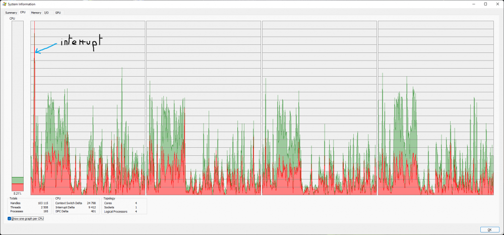 Si vous souhaitez vérifier comment se comporte votre CPU, téléchargez Process Explorer. https://learn.microsoft.com/fr-fr/sysinternals/downloads/process-explorer Une fois téléchargé, cliquez sur le rectangle comme indiqué ci-dessous pour afficher le graphique CPU. Il est possible de le faire avec le Gestionnaire des tâches intégré à Windows, mais Process Explorer est bien plus complet.