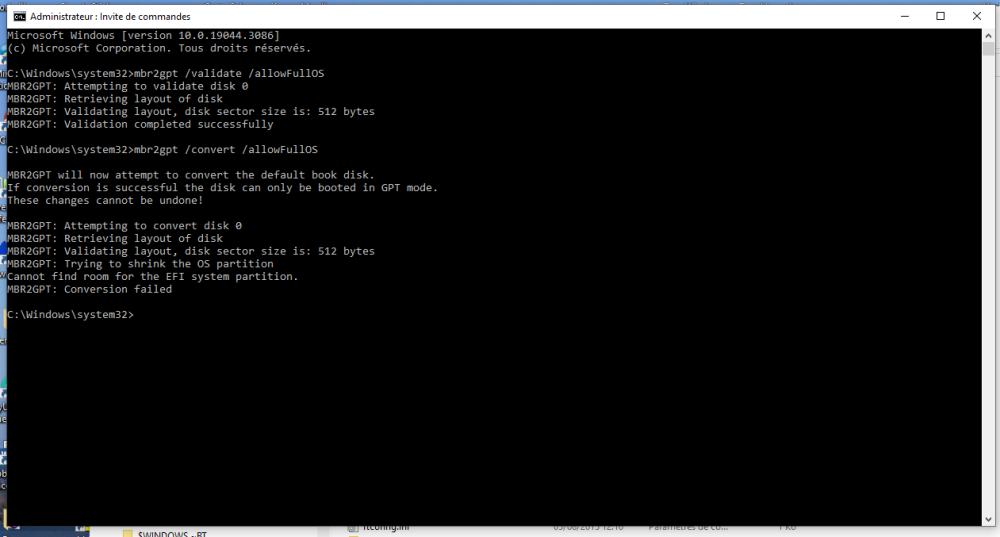 @calisto06 : je viens de faire comme tu l'as suggéré (suppression de D et agrandissement de celle de 539 M) mais j'ai toujours l'erreur : Cannot find room for the EFI system partition. Pas simple à mettre en oeuvre ce MBR2GPT !!