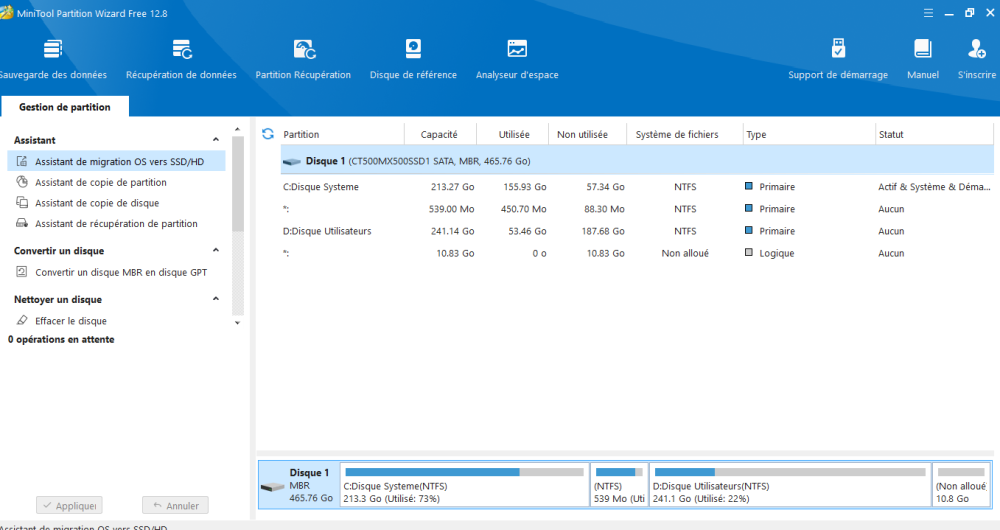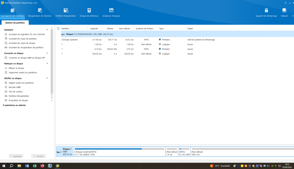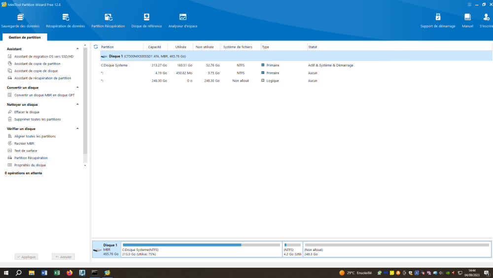 je mets la copie d'écran du diskpart ainsi de minitoolspartition et de l'utilitaire windows gestion disque. Une remarque peut-etre sans interet mais tout au début du fil, cet utilitaire montrait un espace libre. Maintenant on n'a plus de zone espace libre. N'est ce pas cela qui manque? Par contre je ne sais pas comment en créer une...