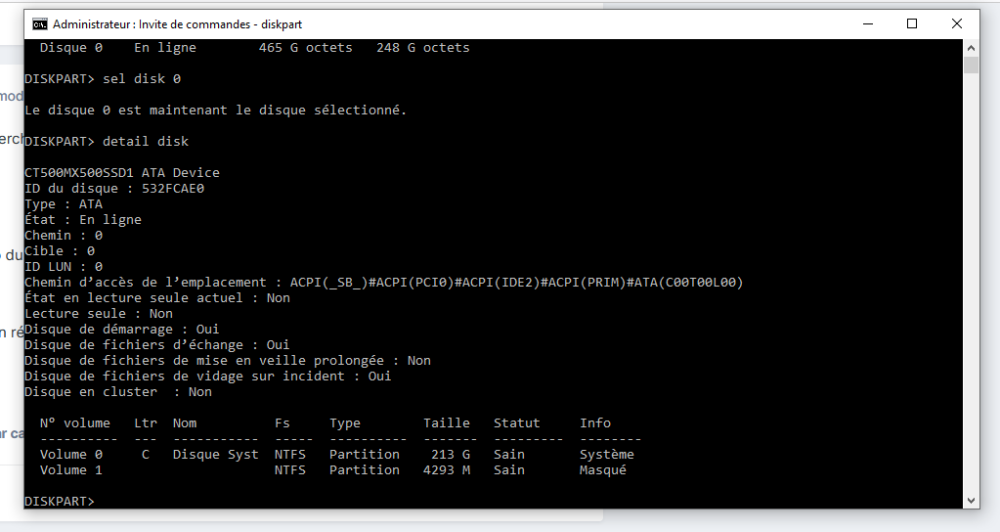 Voila ce que j'obtiens après débranchement d'un des 2 disques après avoir fait la copie des 2 disques. https://www.zupimages.net/viewer.php?id=23/07/1997.jpg Et ça quelque soit le disque que je débranche (enfin de souvenir...peut-être pas tout à fait les mêmes lignes... mais de toute façon j'arrive à démarrer sur le disque WD)