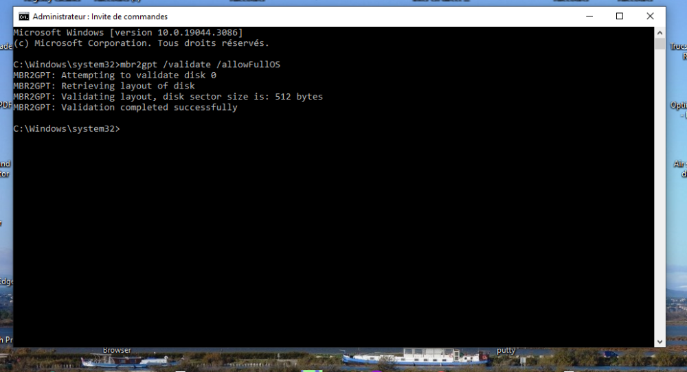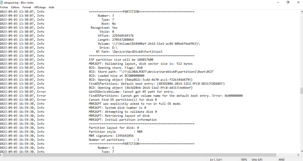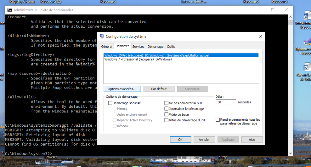 sur D il n'y a que des fichiers utilisateurs (word excel photos...) J'ai trouvé (mais ne retrouve plus le lien) sur internet une vidéo qui regardait le fichier setupact.log ou on voit l'erreur de mbr2gpt. le type avait l'air d'en déduire un pb sur le bcd file (?) et avec msconf il mettait la ligne de démarrage du boot "par défaut". Je l'ai fait et du coup le "validate" de mbr2gpt n'est plus en erreur. Par contre quand je rebootais je n'avais plus de réseau. j'ai "joué" avec msconf et les services et ça refonctionne. Bon j'ai pas tout compris (et de loin) à ce que j'ai fait mais le vaildate fonctionne. Je vais passer au convert et vous tiendrait au courant. Si quelqu'un comprend et sait interpréter le fichier setupact.log, je suis preneur. Je vais essayer de retrouver le lien de cette vidéo pour vous le mettre.