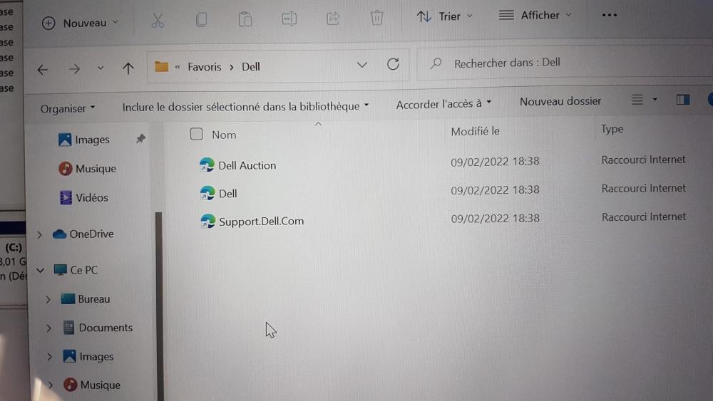 (je suis sur WIN 11 Pro) A la présentation près de ce que tu montres (je ne sais si c'est cela que tu appelles bibliothèques ?) j'ai en plus : - ce qui ressemble à un dossier contacts (vide) - un dossier Favoris comportant 2 sous dossiers Dell (non vide) et volets de favoris (vide) et Bing - un dossier Liens comportant 2 raccourcis Bureau et Téléchargement - OneDrive (jamais utilisé) - Un dossier Parties enregistrées (vide) -Un dossier Recherches comportant un sous dossier C'est tout Merci -