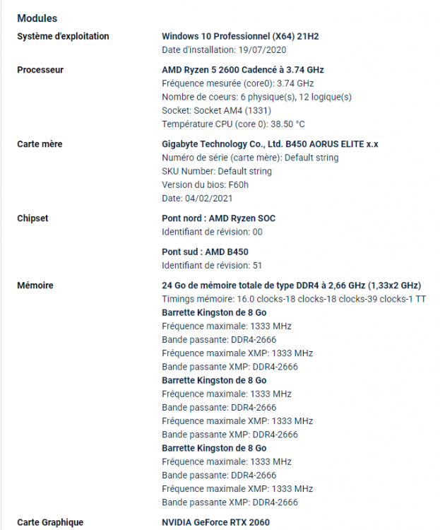 6. Bonjour, Alors voilà, j'ai actuellement 2 barrettes de RAM de 8Go (donc 16Go actuellement) et je voulais monter à 32Go. J'ai donc commandé 2 nouvelles barrettes qui sont, à part les écriture sur la barrettes) exactement les mêmes (HyperX Fury DDR4 2666MHz 8Go) mais comme vous pouvez le voir dans les screens, quand j'en rajoute une eh bien les 3 sont détectées mais je n'ai accès qu'à 8Go... Et dans l'autre quand il y en a que 2 barrettes, tout marche bien.. Auriez-vous une solutions ? Le pb ne provient pas des barrettes ni des slots en eux-mêmes. Et la catégorie matériel réservé atteint 16.1 Go, soit ce dont je devrais avoir accès. Je rajoute que lorsque les 4 barrettes sont dans leus slots, le pc ne s'allume pas... Ma CM est une Gigabyte B450 Aorus Elite. Merci bcp pour votre aide.