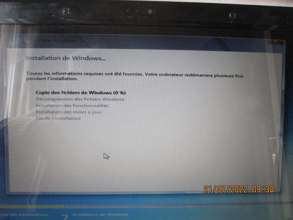 bonjour,mon pc avait deja fait l objet d une intervention il y a deux mois ,mais cela n avait pas abouti.je m y suis remis et j ai refabriqué un iso windows 7 premium.cette fois ci je boote correctement et atterri sur l ecran installer Windows/puis sur l ecran ou on demande le choix :soit reparation ou installation complete j ai donc choisi "R" et apres qq instants j ai vu apparaitre l ecran bleu,mais c tout et apres plusieurs heures cela n avancait plus.Donc j ai coupé le systeme Ce matin je réessaye mais je ne vais pas jusqu à l ecran "installer windows",on m affiche le curseur et c tout Pourquoi est ce que je n avance pas??? je réesaye et c est identique j ai le message"windows is loading files" mais apres 1 heure aucun resultat visible est ce que cela peut provenir de la qualité du disque ISO? -
