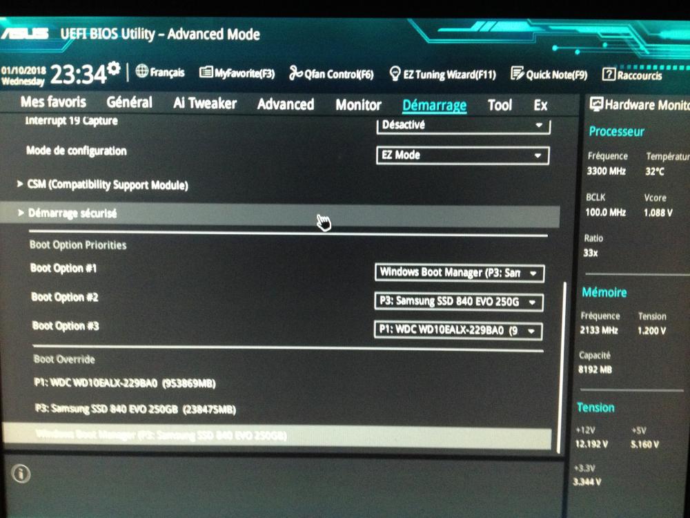 Conscient du désagrément et afin de résoudre le souci, je vous invite, Monsieur à faire un CLEAR CMOS, connu aussi par CLEAR RTC. qui consiste à remettre à zéro la mémoire du BIOS de la carte mère pour la réinitialiser : https://www.asus.com/fr/support/FAQ/1000851/