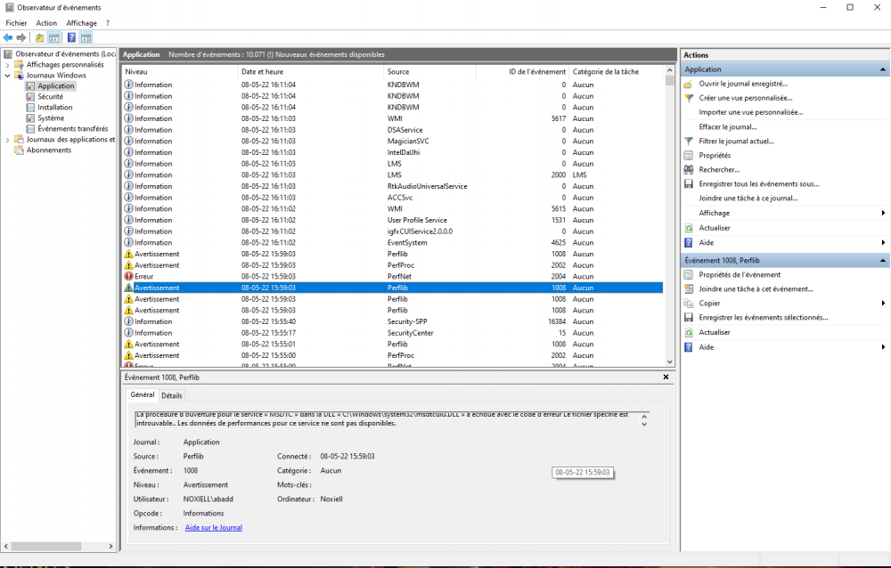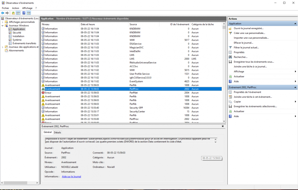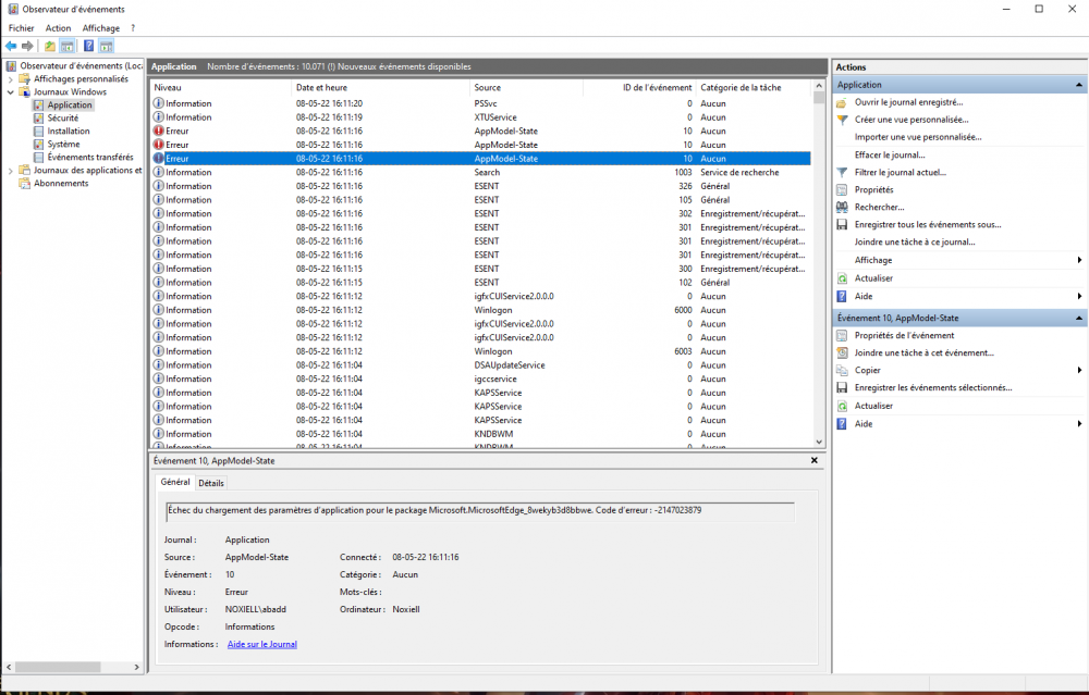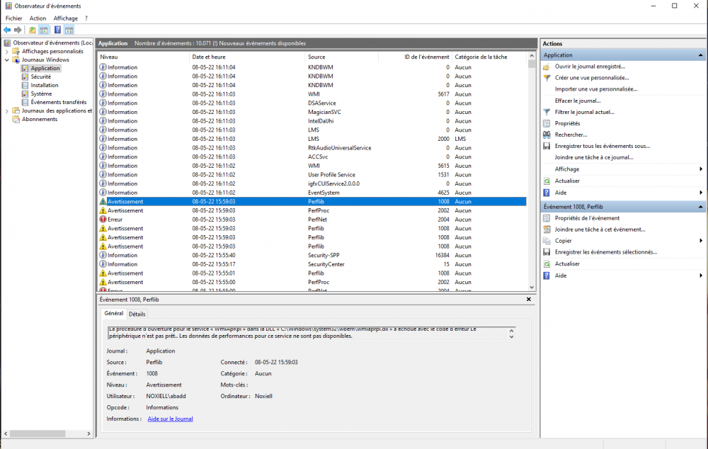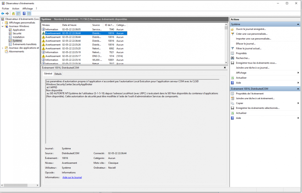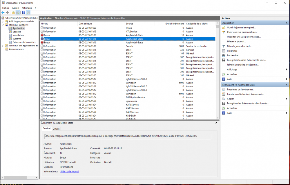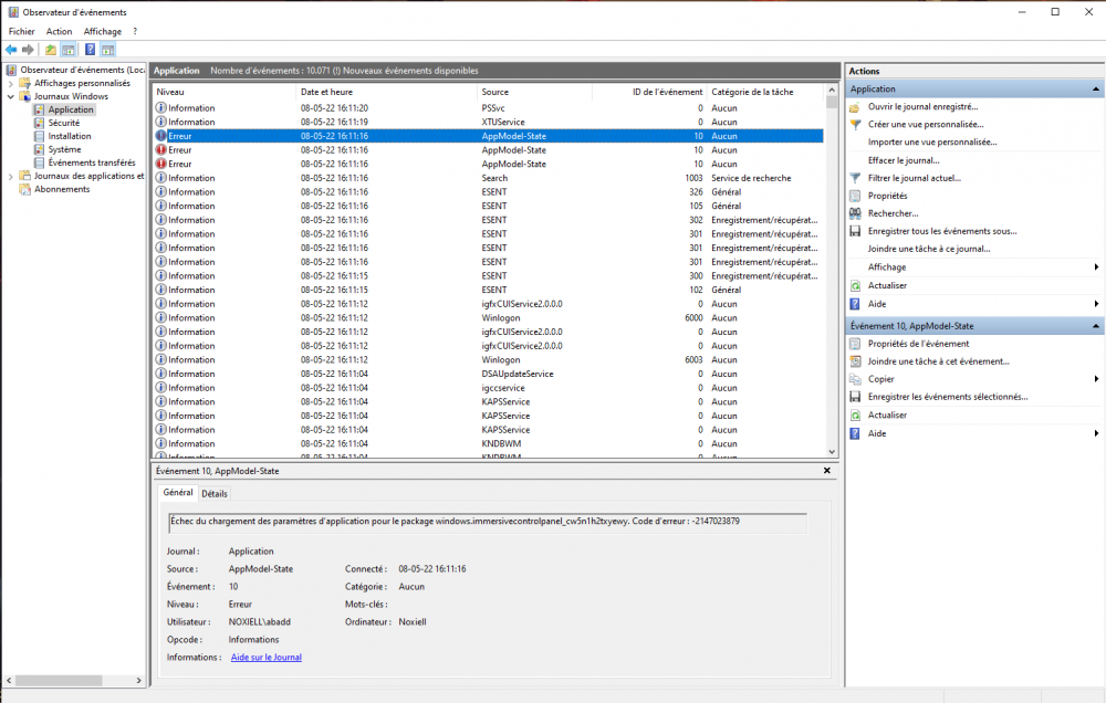 bonjour, alors je n'ai malheureusement pas pu retrouver le moment précis de cet écran bleu spécifique dans l'observateur, aussi après 2 jour d'utilisation sans bdso, je viens à l'instant d'en avoir un nouveau (unexpected store exeption, encore une fois avec lamusique du jeu qui s'est coupé bien avant au moins 3-5 minutes je dirais) aussi cette fois-ci, après redémarrage, le pc à pris plusieurs minutes à tourner dans le vide et j'ai dû le relancer une fois via le boouton power voici quelques screen de ce que je peux trouver dans l'observateur sur ça, s'il vous faut quelques chose de plus spécifique je reste a votre disposition. également fourni quelques données d'une appli donnant le niveau de chauffe qu'on m'a récemment conseillé d'installer. (ces données sont prises pendant que Genshin seulement tourne, avec les ventilateur mis au max..) merci d'avance pour vos futures réponse ! -