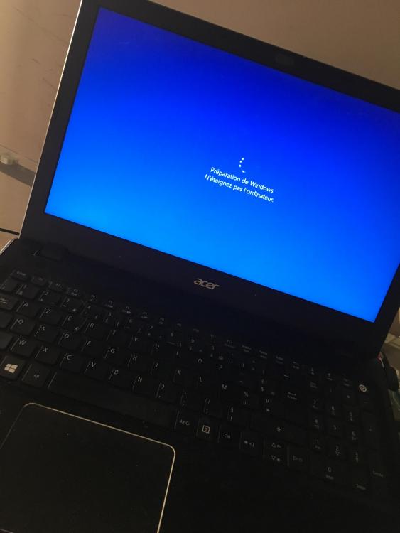 1. Bonjour, je suis encore une fois bloqué sur l’écran « préparation de Windows N’eteignez pas l’ordinateur » alors que je demandais un simple redemmarage de l’appareil (comme la première fois). J’ai un Acer Aspire F5-572 series, equipé d’un intel core i7, d’une Nvidia Geforce940M, acheté été 2016. La première fois que ça m’est arrivé j’ai laissé l’ordi sur cette page pendant 15h sans que rien ne se passe, alors que j’avais juste demandé à l’ordi de redemmarer, et j’avais fini par reboot mon PC. Là, soit 2jours après la premiere fois, je demande a mon pc de redemmarrer et sa m’affiche encore « Preparation de Windows N’eteignez pas l’ordinateur » alors que je n’ai ni forcé l’arret ni autre chose. J’ai lu a peu près tout les forums sur le sujet, mon cerveau est a deux doigts d’exploser, je tente de garder mon calme mais c’est assez compliqué Merci, toute reponse est la bienvenue, toute solution est attendue avec enorme plaisir!