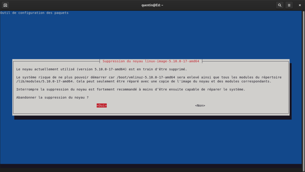 Bonjour à toutes et à tous, Je cherche à restaurer mon ancienne version de noyau Linux car la version courante du noyau cause des dysfonctionnement (cf. le sujet que j'ai posté hier). Pour y arriver, j'ai décidé de suivre une procédure de moyens.net. D'abord j’identifie les paquets de noyaux installés avec dpkg --list | grep linux-image. J'obtiens : rc linux-image-5.10.0-13-amd64 5.10.106-1 amd64 Linux 5.10 for 64-bit PCs (signed) rc linux-image-5.10.0-14-amd64 5.10.113-1 amd64 Linux 5.10 for 64-bit PCs (signed) ii linux-image-5.10.0-15-amd64 5.10.120-1 amd64 Linux 5.10 for 64-bit PCs (signed) ii linux-image-5.10.0-16-amd64 5.10.127-2 amd64 Linux 5.10 for 64-bit PCs (signed) ii linux-image-5.10.0-17-amd64 5.10.136-1 amd64 Linux 5.10 for 64-bit PCs (signed) ii linux-image-amd64 Ensuite je supprime le dernier paquet installer avec apt remove linux-image-5.10.0-17-amd64. Et là j'ai le message d'avertissement ci-dessous. Est-ce que d'après vous je peux continuer la suppression sans risques ? Etant donné que j'ai du travail en cours sur mon PC je préférerais être sûr de ne pas faire de bêtises... Merci d'avance si vous pouvez confirmer ou si vous avez une meilleure méthode,