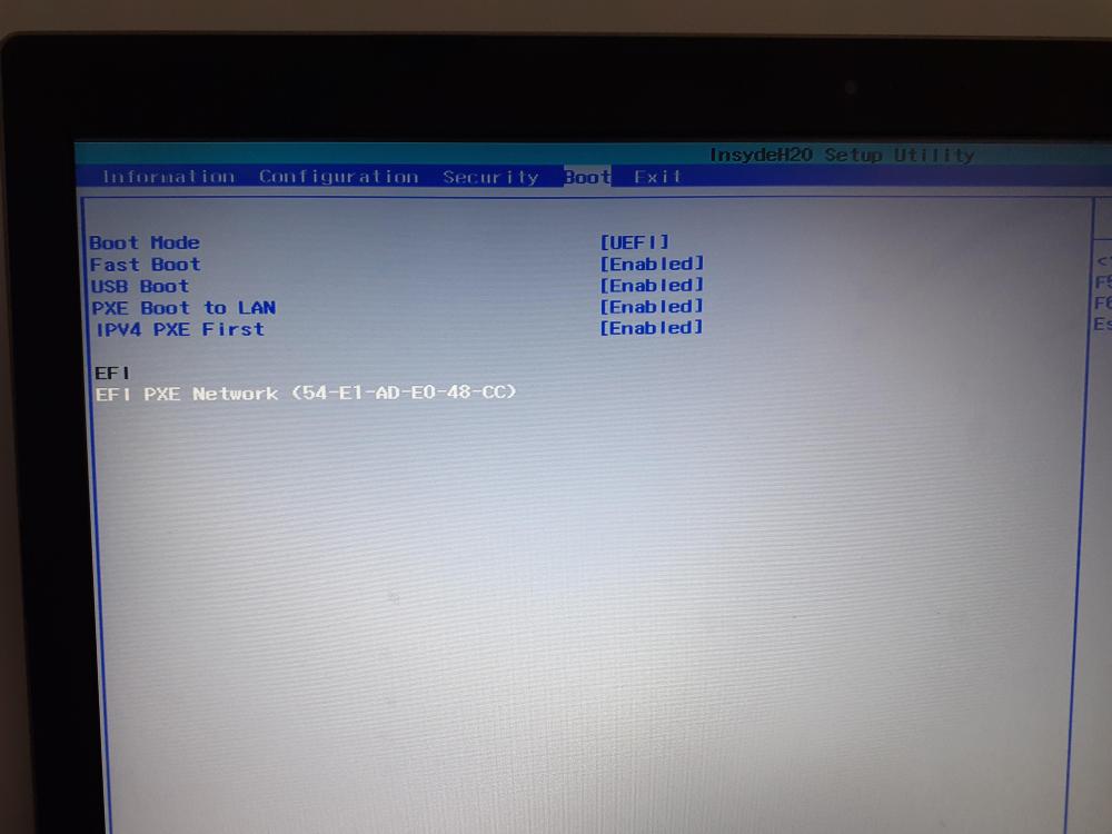 11. Bonjour, Mon ordinateur affiche au démarrage le message suivant " start pxe over ip4v or press esc for exit". Je n y connais rien en configuration informatique. J ai fait quelques recherches sur internet. J ai suivi les conseils d un article qui propose de redémarrer l ordi et de tout de suite cliquer sur f2 ou f1 ou supp, ce que j ai fait. Je suis maintenant sur un écran " InsydeH20 Setup Utility" mais je ne sais pas quelle manip faire pour résoudre mon problème. Est ce que l un d entre vous pourrait m aider? D avance merci!!!! Mary