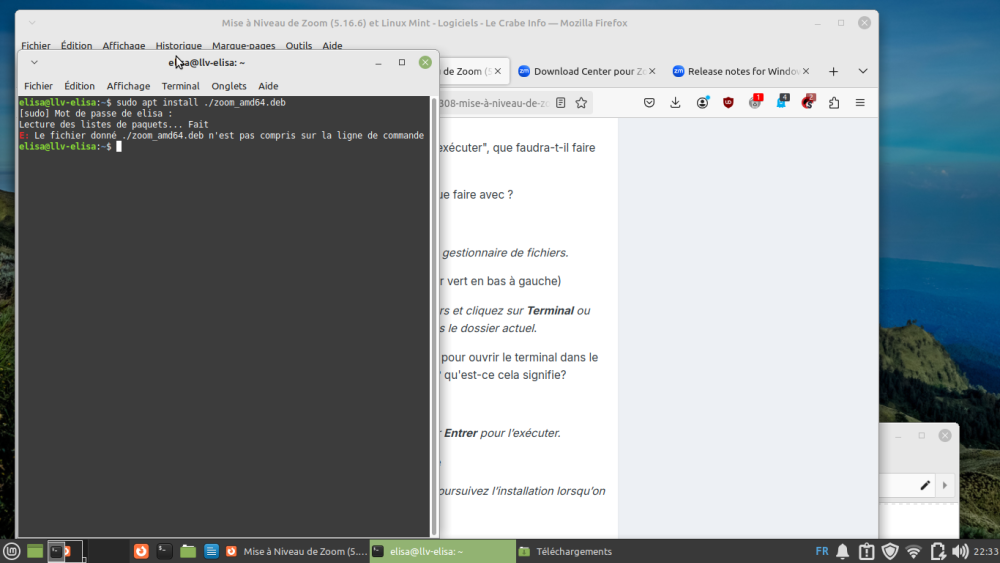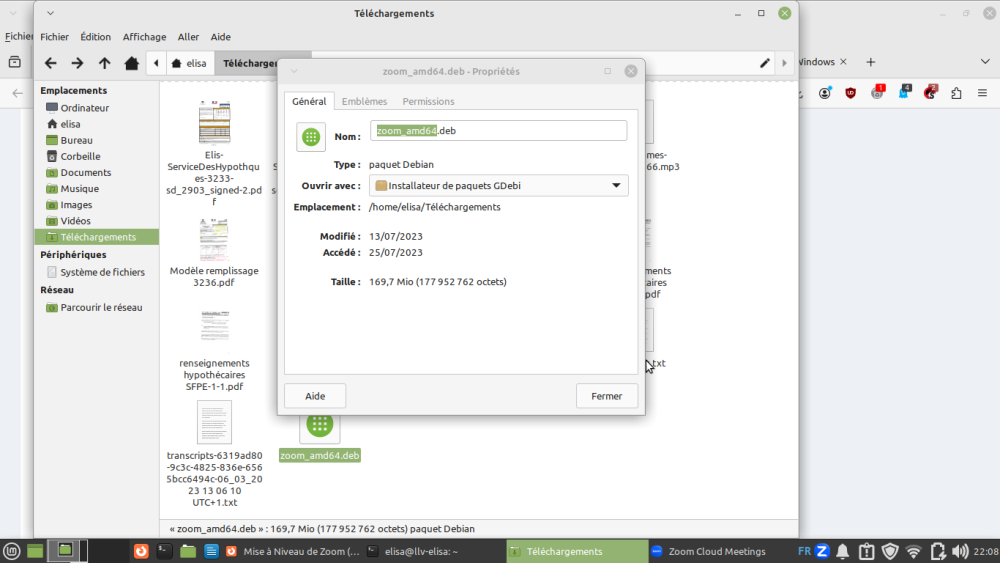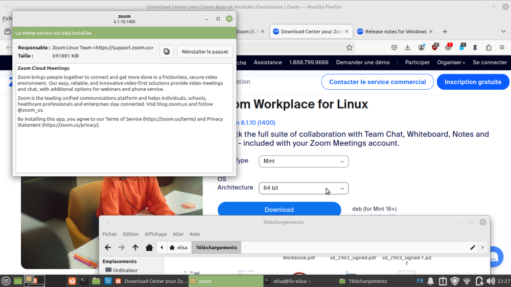 Bonsoir @zelandonii , C'est déjà installé (voir précédent email). Je tente d'expliquer Je suis allée dans le "Thunar" pour rechercher zoom_amd64 J'ai effectué un clique droit, puis , j'ai choisis " Ouvrir avec "installateur de paquets Gdebi" " Résultat : capture d'écran dans les précédents emails "déja installé" (j'ai dû le faire deux fois) Je rajoute une capture d"écran. Je dois juste ouvrir un lien d'un webinar , afin de constater si je retrouve tout comme avant. Je laisse le regard d'un tech me confirmer l'installation , n'est-ce pas @zelandonii Merci par avance, Bonne fin de soirée, Elis