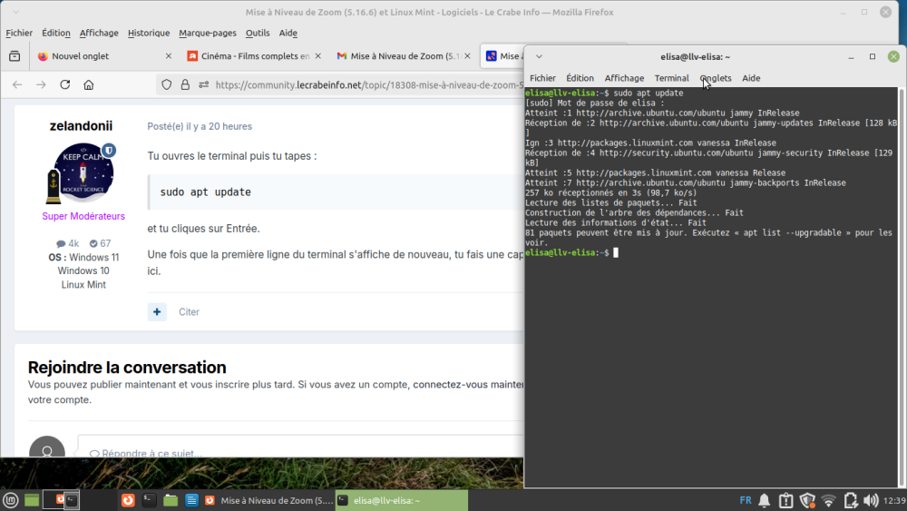Bonjour @zelandonii , Oui, la mise à jour est réalisée (voir capture d'écran -le bouclier). Mais, ce n'était pas le problème rencontré. Problème renconté: la mise à jour de la version Zoom (voir capture d'écran) Bon, j'ai un "niveau gratuit" de Zoom. Cependant, il est possible de mettre à jour avec un niveau gratuit. Il faudrait la version 5.16.6 au minimum pour de nouveau pouvoir utiliser Zoom. Aucune mise à jour ne m'a été proposée. Donc, j'ai regardé dans "logithèque", mais il n'y avait rien. Question: Comment mettre à jour (version 5.16.6 au minimun) Zoom avec Linux Mint Vanessa? Merci par avance pour les infos . Bonne journée, Elis