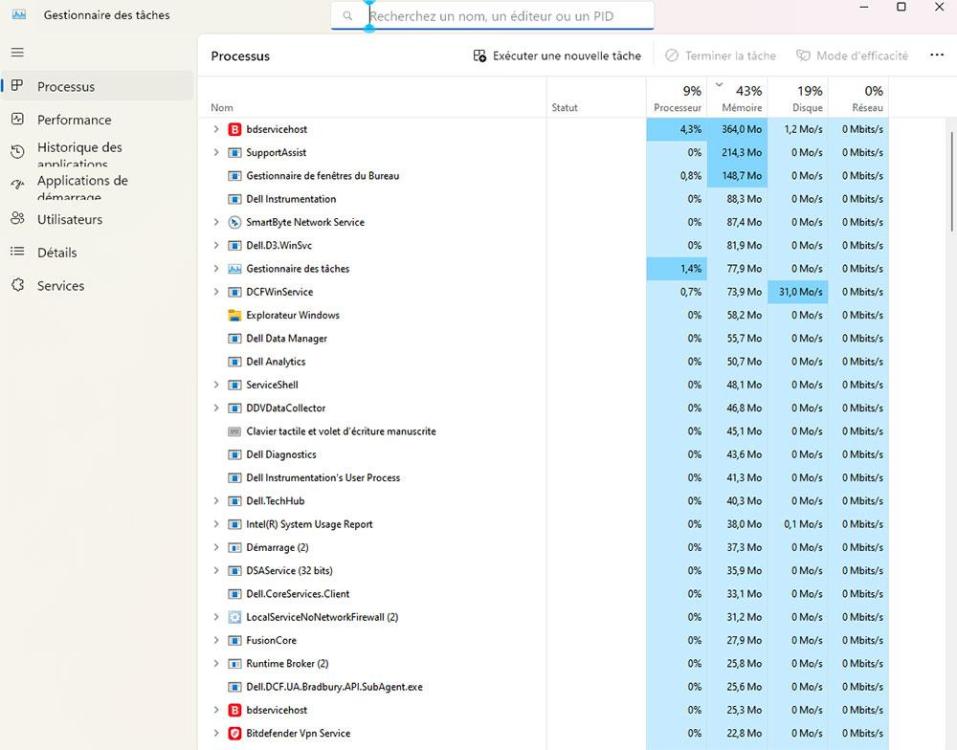 Le démarrage est normal sans anomalie mais plus lent. Je vais m'intéresser à Bitdefender. Précédemment cette charge ne provoquait pas de ralentissement au démarrage. Cordialement