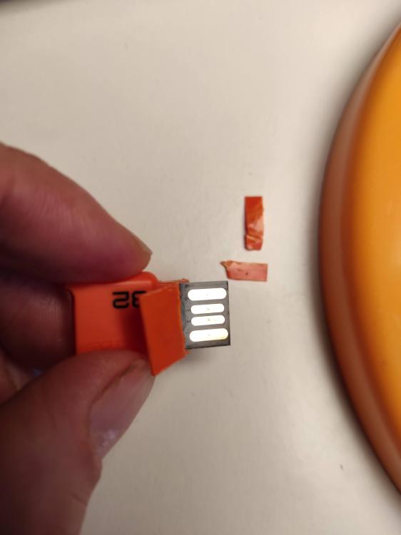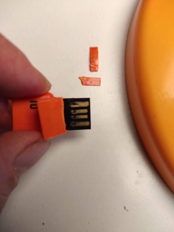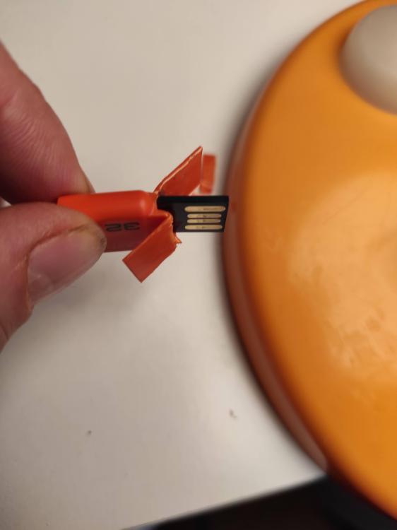 18. Bonjour la communauté ! Bonjour @Delta ! Je m'excuse pour mon retour tardif (j'ai été très occupée ailleurs). J'ai bien désolidarisé la clef de son moule avec patience et une lame de couteau chauffée. 🙂 Côté recto : RAS, en apparence, du point de vue des composants, mais présence d'une légère courbure concave vers l'extérieur de la pièce. Côté verso : la fameuse pliure de la pièce probablement à l'origine du dysfonctionnement. C'est grave, Docteur ? Que préconises-tu stp comme solution(s) possible(s) ? Par avance, merci beaucoup pour ta réponse ! 🙏 NB : Tu l'auras noté, cette clef USB n'a pas la même apparence que celle que @Le PoissonClown et toi-même avaient postée en photo.