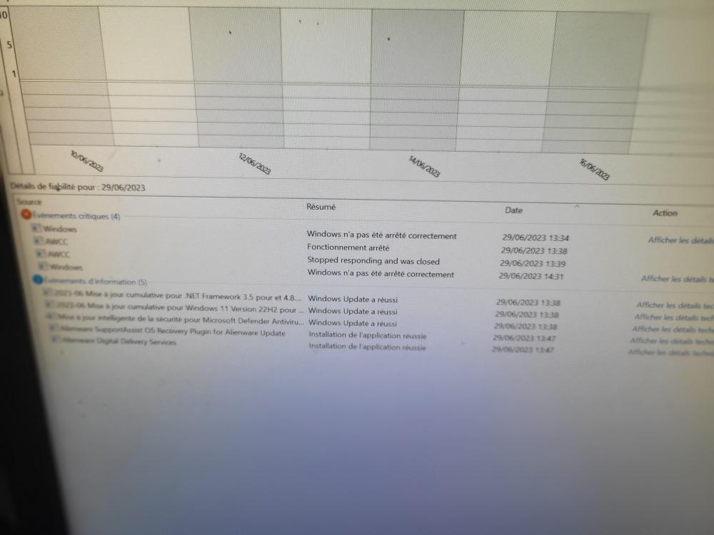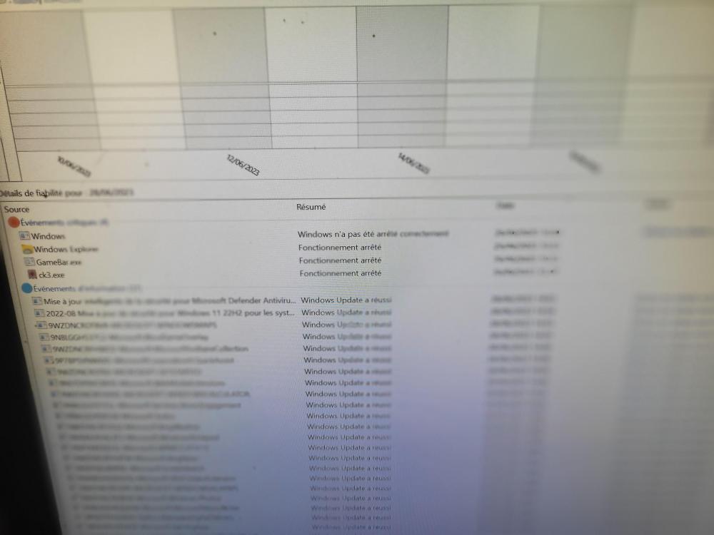 Hello Premier Crash ça y est, je jouais à skyrim rien d autres et le pc a freeze, j'ai dû forcer l arrêt avec bouton power. Il s est rallumé sans soucis.. J'ai ouvert le moniteur de fiabilité pour voir les soucis.. Il y a effectivement des événements critiques et des avertissements depuis plusieurs jours. Le soucis n était pas que le hdd pour le coup..