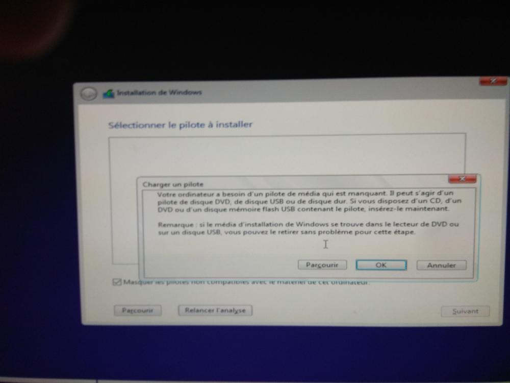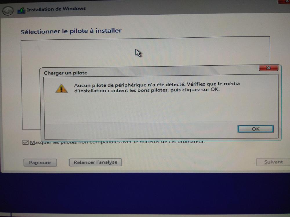 15. Bonjour, À l'aide du tutoriel <<Installer Windows 10 : le guide complet>>, je voudrais installer Windows sur un disque SSD tout neuf. J'ai créé une clé USB comme suggéré dans ce tutoriel. J'ai démarré mon PC à l'aide de cette clé. L'installation de Windows commence mais des écrans (voir fichiers joints) apparaissent concernant un pilote qui serait absent. J'ignore de quoi il s'agit et n'ai aucune idée de la suite à donner. Un coup de pouce serait bien apprécié! Merci.