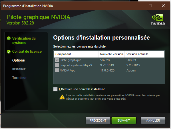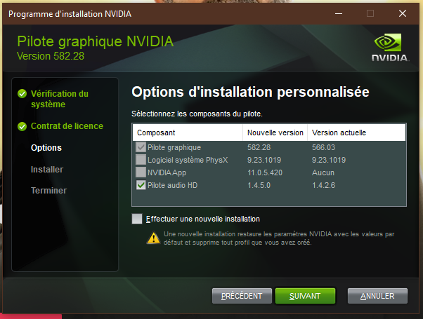 Bonjour, @Delta, Afin de réaliser l'opération que vous m'avez recommandée, j'ai télécharge la dernière version disponible du pilote Nvidia depuis leur site officiel. Cependant, je confesse une certaine confusion puisque, comme vous pouvez le constater sur la capture d'écran ci-dessous, l'installateur dudit pilote ne me propose pas, comme le vôtre, d'installer un quelconque pilote audio. J'ai pourtant le souvenir, lors de précédentes mises à jour du pilote Nvidia, que ce fameux pilote audio était bien présent et installé, si nécessaire. Est-ce que c'est normal (j'imagine que non) ? Pas bon signe (j'imagine que oui) ?... Je précise, tout de même, avoir lancé l'installateur du pilote sans avoir rien désinstallé au préalable. Je voulais d'abord vérifier comment les choses se présentent. Qu'en pensez-vous ?