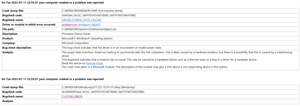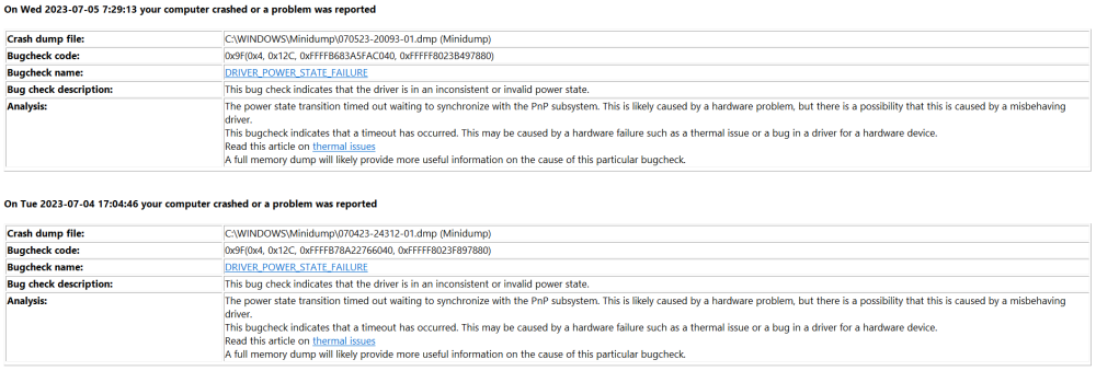 Bonjour, merci à l'avance pour vos conseils. Depuis plusieurs mois, mon Windows plante (BSOD) parfois à l'arrêt du système. Je vous joins l'analyse de « WinDbg ». J'ai tenté de résoudre avec l'aide de Microsoft, mais je n'arrive pas à déterminer l'erreur après avoir exécuter « dt nt!TRIAGE_9F_PNP fffff8023b497880 » et « !thread » dans le debugger. DRIVER_POWER_STATE_FAILURE (9f) A driver has failed to complete a power IRP within a specific time. Arguments: Arg1: 0000000000000004, The power transition timed out waiting to synchronize with the Pnp subsystem. Arg2: 000000000000012c, Timeout in seconds. Arg3: ffffb683a5fac040, The thread currently holding on to the Pnp lock. Arg4: fffff8023b497880, nt!TRIAGE_9F_PNP on Win7 and higher Debugging Details: ------------------ Implicit thread is now ffffb683`a5fac040 KEY_VALUES_STRING: 1 Key : Analysis.CPU.mSec Value: 3405 Key : Analysis.Elapsed.mSec Value: 3444 Key : Analysis.IO.Other.Mb Value: 0 Key : Analysis.IO.Read.Mb Value: 0 Key : Analysis.IO.Write.Mb Value: 0 Key : Analysis.Init.CPU.mSec Value: 796 Key : Analysis.Init.Elapsed.mSec Value: 3769 Key : Analysis.Memory.CommitPeak.Mb Value: 98 Key : Bugcheck.Code.LegacyAPI Value: 0x9f Key : Dump.Attributes.AsUlong Value: 8 Key : Dump.Attributes.KernelGeneratedTriageDump Value: 1 Key : Failure.Bucket Value: 0x9F_4_amd_sata_IMAGE_pci.sys Key : Failure.Hash Value: {95c7d19c-c084-e356-ffb8-0e9c09668a9d} BUGCHECK_CODE: 9f BUGCHECK_P1: 4 BUGCHECK_P2: 12c BUGCHECK_P3: ffffb683a5fac040 BUGCHECK_P4: fffff8023b497880 FILE_IN_CAB: 070523-20093-01.dmp DUMP_FILE_ATTRIBUTES: 0x8 Kernel Generated Triage Dump DRVPOWERSTATE_SUBCODE: 4 IMAGE_NAME: pci.sys MODULE_NAME: pci FAULTING_MODULE: fffff80239ec0000 pci BLACKBOXBSD: 1 (!blackboxbsd) BLACKBOXNTFS: 1 (!blackboxntfs) BLACKBOXWINLOGON: 1 CUSTOMER_CRASH_COUNT: 1 PROCESS_NAME: System STACK_TEXT: fffff802`3b497848 fffff802`35f0bc86 : 00000000`0000009f 00000000`00000004 00000000`0000012c ffffb683`a5fac040 : nt!KeBugCheckEx fffff802`3b497850 fffff802`363b56b6 : 00000000`00000000 00000000`00000001 00000000`00000080 fffff802`328c2180 : nt!PnpBugcheckPowerTimeout+0x76 fffff802`3b4978b0 fffff802`35c8bbd2 : ffffca01`74d56330 fffff802`328c2180 fffff802`3b497b18 00000000`00000000 : nt!PopBuildDeviceNotifyListWatchdog+0x16 fffff802`3b4978e0 fffff802`35c8ac4d : 00000000`00000000 00000000`00000000 00000000`00140001 00000000`00008aed : nt!KiProcessExpiredTimerList+0x172 fffff802`3b4979d0 fffff802`35e0092e : 00000000`00000000 fffff802`328c2180 fffff802`36727a00 ffffb683`ac5532c0 : nt!KiRetireDpcList+0x5dd fffff802`3b497c60 00000000`00000000 : fffff802`3b498000 fffff802`3b492000 00000000`00000000 00000000`00000000 : nt!KiIdleLoop+0x9e IMAGE_VERSION: 10.0.19041.3155 STACK_COMMAND: .cxr; .ecxr ; kb FAILURE_BUCKET_ID: 0x9F_4_amd_sata_IMAGE_pci.sys OSPLATFORM_TYPE: x64 OSNAME: Windows 10 FAILURE_ID_HASH: {95c7d19c-c084-e356-ffb8-0e9c09668a9d} Followup: MachineOwner ------------------ kd> dt nt!_TRIAGE_9F_PNP fffff8023b497880 +0x000 Signature : 0x8001 +0x002 Revision : 2 +0x008 CompletionQueue : 0xfffff802`366449e0 _TRIAGE_PNP_DEVICE_COMPLETION_QUEUE +0x010 DelayedWorkQueue : 0xffffb683`a5297a20 _TRIAGE_EX_WORK_QUEUE +0x018 DelayedIoWorkQueue : 0xffffb683`a526b550 _TRIAGE_EX_WORK_QUEUE ------------------ kd> !thread THREAD ffffb683a5fac040 Cid 0004.018c Teb: 0000000000000000 Win32Thread: 0000000000000000 WAIT: (Executive) KernelMode Non-Alertable ffffca017492bec0 SynchronizationEvent Not impersonating GetUlongFromAddress: unable to read from fffff8023661152c Owning Process ffffb683a528e040 Image: System Attached Process N/A Image: N/A fffff78000000000: Unable to get shared data Wait Start TickCount 40428 Context Switch Count 8327 IdealProcessor: 1 NoStackSwap ReadMemory error: Cannot get nt!KeMaximumIncrement value. UserTime 00:00:00.000 KernelTime 00:00:00.000 Win32 Start Address nt!ExpWorkerThread (0xfffff80235c8e4c0) Stack Init ffffca017492cc90 Current ffffca017492bad0 Base ffffca017492d000 Limit ffffca0174927000 Call 0000000000000000 Priority 15 BasePriority 12 PriorityDecrement 0 IoPriority 2 PagePriority 5 Child-SP RetAddr : Args to Child : Call Site ffffca01`7492bb10 fffff802`35c1c9c0 : ffffcb80`7bb5d180 00000000`ffffffff 00000000`00000000 ffffca01`00000000 : nt!KiSwapContext+0x76 ffffca01`7492bc50 fffff802`35c1beef : 00000001`00000002 00000000`00000001 ffffca01`7492be10 fffff802`00000000 : nt!KiSwapThread+0x500 ffffca01`7492bd00 fffff802`35c1b793 : 000a9cc0`00000000 00000000`00000000 00000000`ffffff00 ffffb683`a5fac180 : nt!KiCommitThreadWait+0x14f ffffca01`7492bda0 fffff802`3a211740 : ffffca01`7492bec0 ffffb683`00000000 ffffb683`a9cc3100 ffffca01`7492bf00 : nt!KeWaitForSingleObject+0x233 ffffca01`7492be90 fffff802`3a218160 : ffffb683`ac2ec1a0 ffffca01`7492c400 00000000`00000020 00000000`00000000 : storport!RaSendIrpSynchronous+0x90 ffffca01`7492bef0 fffff802`3a217e9c : ffffca01`7492c470 ffffca01`7492c4a0 ffffca01`7492c4b0 00000000`00000002 : storport!RaidBusEnumeratorIssueSynchronousRequest+0x128 ffffca01`7492c120 fffff802`3a217cbf : ffffb683`ac233460 00000000`00000000 ffffca01`7492c240 ffffca01`7492c470 : storport!RaidBusEnumeratorIssueReportLuns+0x6c ffffca01`7492c170 fffff802`3a2178fa : 00000000`00000000 00000000`00000000 00000000`00000000 fffff802`3a211120 : storport!RaidBusEnumeratorGetLunListFromTarget+0x7b ffffca01`7492c1f0 fffff802`3a217801 : ffffb683`a5372080 00000000`00000000 ffffca01`7492c310 00000000`4d53445f : storport!RaidBusEnumeratorGetLunList+0x7a ffffca01`7492c2e0 fffff802`3a216f75 : 00000000`00000000 ffffca01`7492c500 00000000`00000001 00000000`00000000 : storport!RaidAdapterEnumerateBus+0x99 ffffca01`7492c450 fffff802`3a216ab7 : ffffb683`a5d941a0 ffffca01`7492c5b0 00000000`00000000 fffff802`35cf8200 : storport!RaidAdapterRescanBus+0xb5 ffffca01`7492c530 fffff802`3a2169a5 : 00000000`00000000 00000000`00000000 ffffb683`a9579d10 00000000`00000000 : storport!RaidAdapterQueryDeviceRelationsIrp+0xb3 ffffca01`7492c5f0 fffff802`3a20bcef : 00000000